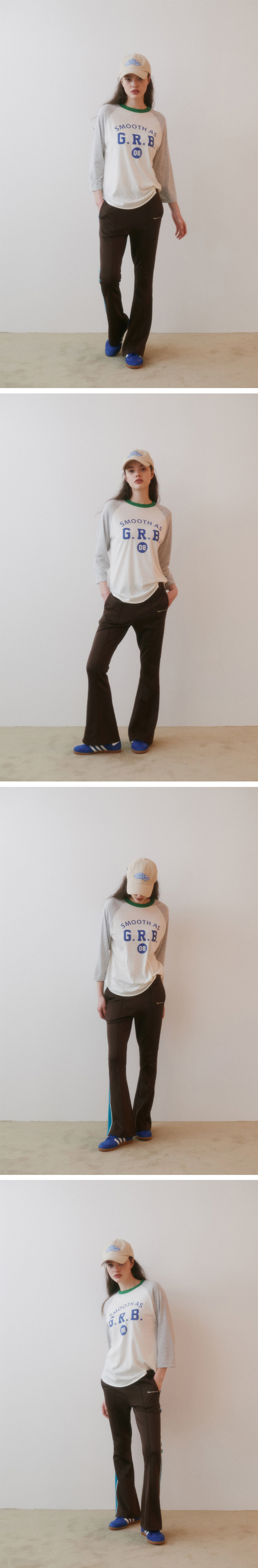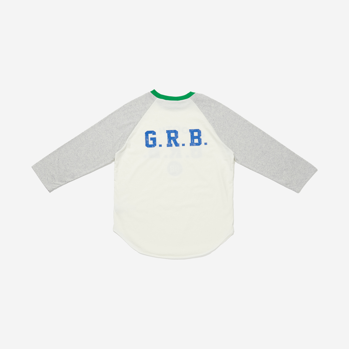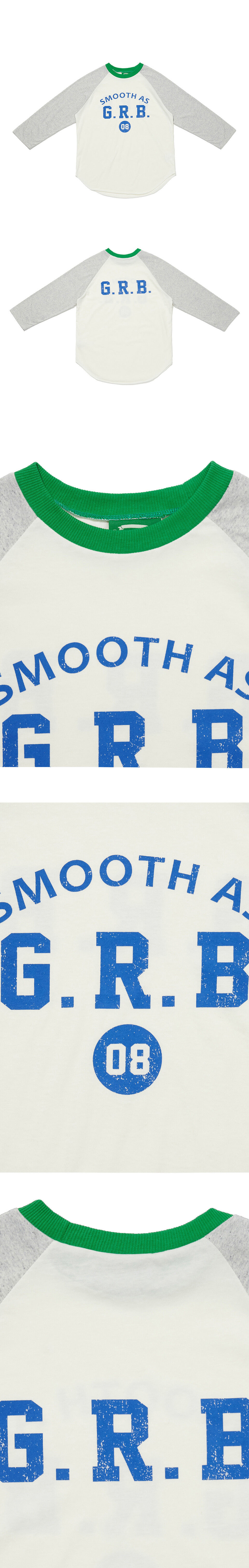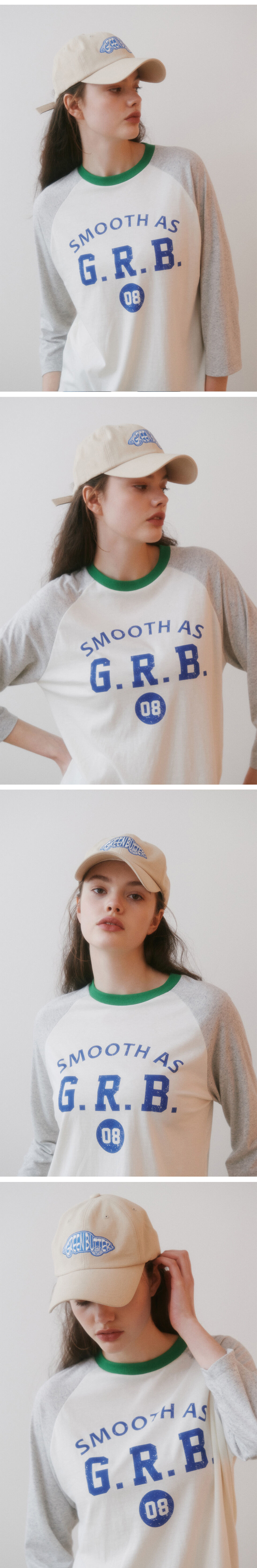 그린버터의 텍스트프린트가 돋보이는 7부기장의 래글런티셔츠입니다. 덤블워싱, 텐타가공을 통해 수축률을 최소화하였고, 소매는 입자감이 돋보이는 원단을 사용한 제품입니다.