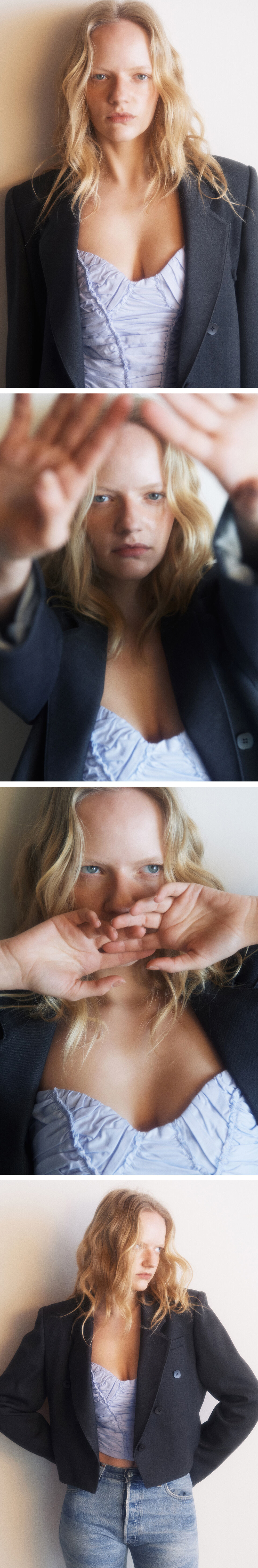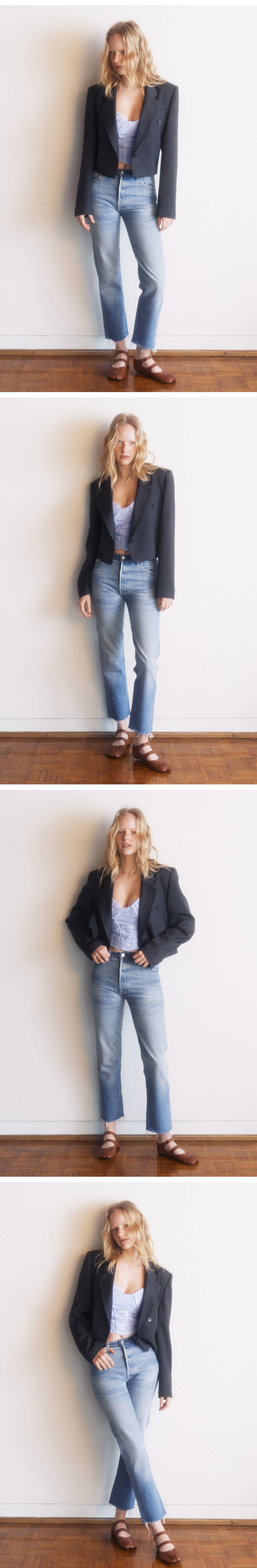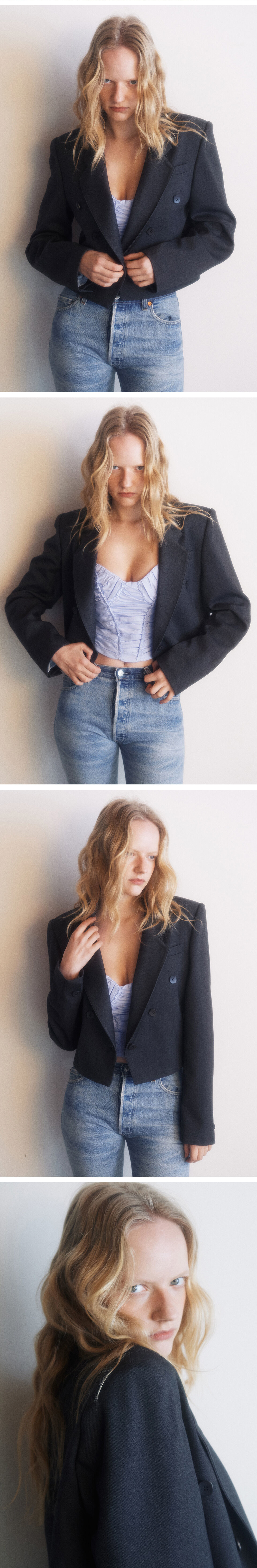 살짝 여유있는 어깨품의 디자인으로, 어깨패드를 넣어 어깨를 쳐지지않도록 했습니다. 브이형태로 떨어어지는 밑단이 포인트이며, 단추는 네모형태로 심플하지만 키치한 무드로 표현했습니다. 찰랑거리는 듯 부드러운 터치감이지만 탄탄한 원단을 채용해 어깨에서 소매로 이어지는 실루엣을 신경쓴 디자인입니다.