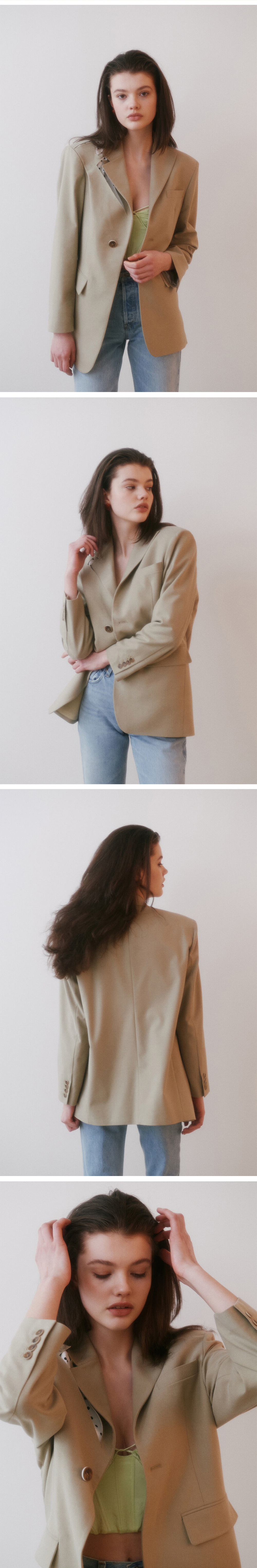 좌, 우 다른기장의 유니크한 디자인으로, 지그재그 트임속의 도트포인트는 한번 더 뒤집어지지 않게 고정해 주어 완성도를 높인제품입니다. 여유로운 품의 자켓으로, 어깨패드를 넣어 큰 품의 어깨가 쳐지지 않게 하였고, 톤 앤 톤의 안감과 단추를 채용해 포인트를 주었습니다.