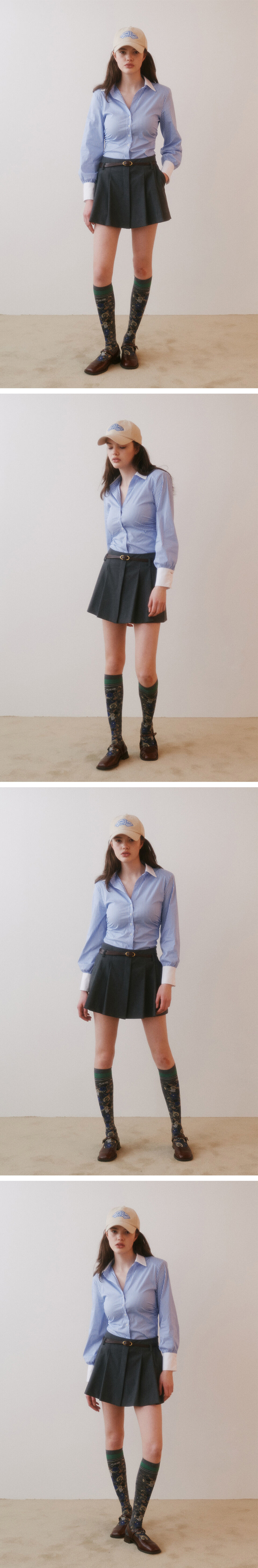 벨트와 함께 구성된 크롭기장의 치마바지로, 앞판에 날개형태로 가려진 플리츠가 스커트라인으로 보여집니다. 찰랑거리는 듯 부드러운 터치감이지만 탄탄한 원단을 사용해 A라인으로 떨어지며, 여유로운 밑단품이 특징입니다.