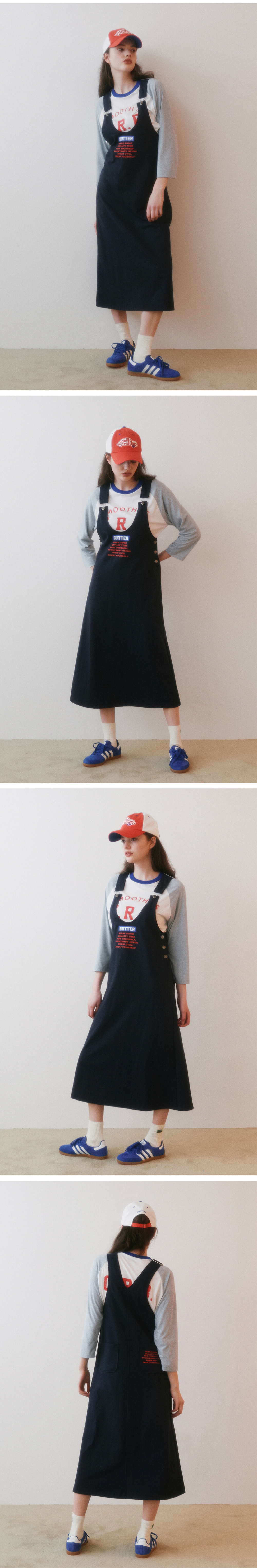 덤블워싱, 텐타가공을 통해 수축률을 최소화한 멜빵원피스입니다. 긴 기장감의 원피스로 깊은 넥라인이 특징인 제품입니다. 탄탄한 두께감의 원단을 사용해 비침이 적으며 여유있는 품으로 활동이 편하고 ,어깨의 끈길이가 조절가능한 멜빵원피스입니다.