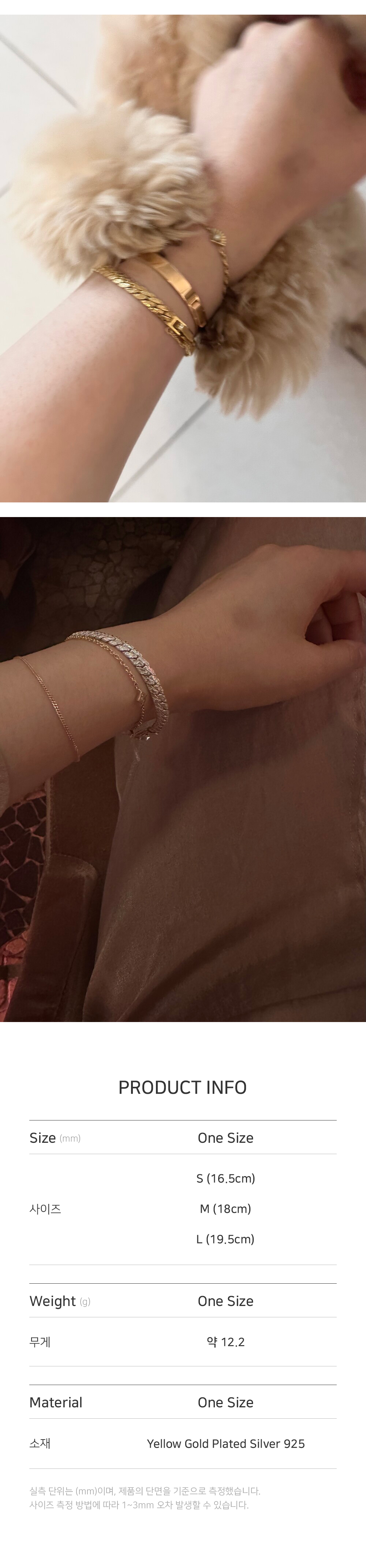 머리를 땋은듯한 티테일이 페미닌 한 무드와 빈티지 한 텍스처가 특징인 팔찌입니다. 남녀 모두 착용하기 좋은 중성적 이면서도 무게감이 있는 체인입니다. 사이즈는 배송란에 손목 둘레를 기입해 주세요. 마망에필레는 오더메이드 방식으로 주문 후 교환 및 환불이 불가합니다. 제작 기간은 주말과 공휴일을 제외하고 10-14일 소요됩니다. 샘플과 최대한 같은 형태로 제작하고 있으나 핸드메이드 특성상 근소한 차이가 있을 수 있습니다. 기타 문의사항은 CS 010 8468 3791 또는 카카오톡 mamanetfille으로 연락 주시기 바랍니다. 빠른 기간 내에 받아 보셔야 하는 경우에는 CS 010 8468 3791로 문의하시기 바랍니다.