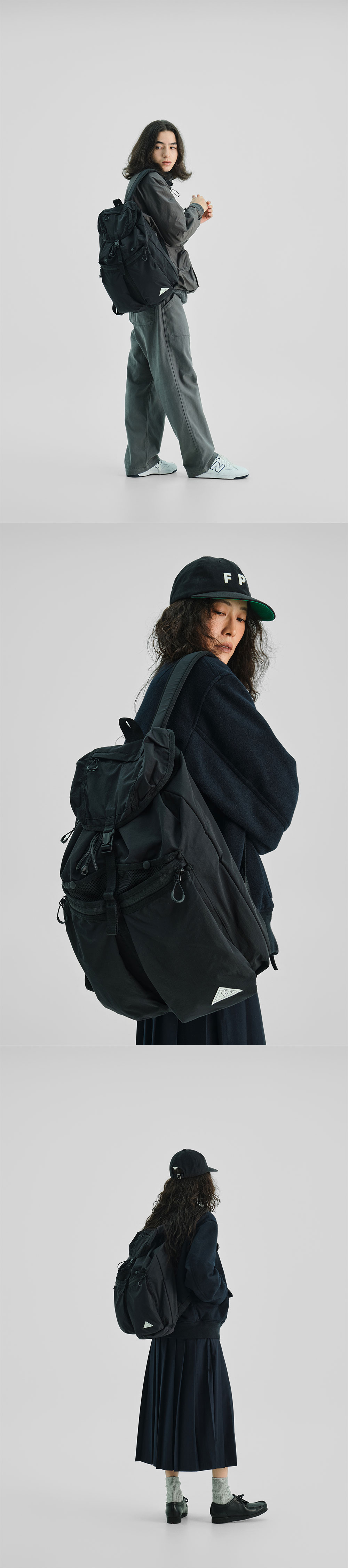 PRODUCT: BACKPACK COLOR: BLACK SIZE: W:31cm H:56cm D6~18cm OUTSHELL: NYLON 100% LINING: NYLON 100% PRICE: 158,000 KRW - 특별한 패턴의 반응형 부피 조절 구조 - 레이어 구조로 효과적인 공간 활용의 전면 2포켓 - 조리개 방식의 메인 포켓, 편의를 위한 세로 사이드 지퍼 - 덮개 공간을 활용한 지퍼 포켓 - 내부 슬리브를 이용 안정적인 노트북 수납과 충전기를 위한 별도의 메쉬 포켓 - 어깨 끈에 체스트 스트랩 달아두어 안정적인 착용감 - 발수 효과가 뛰어난 실리콘 코팅 립 원단 - 뛰어난 퀄리티의 우진 플라스틱 부자재 사용