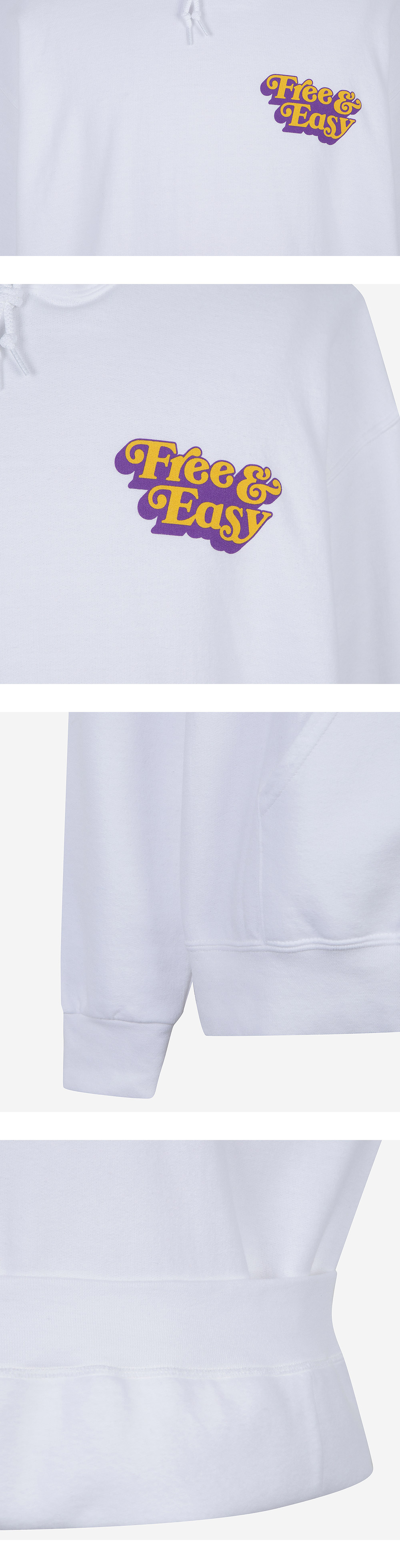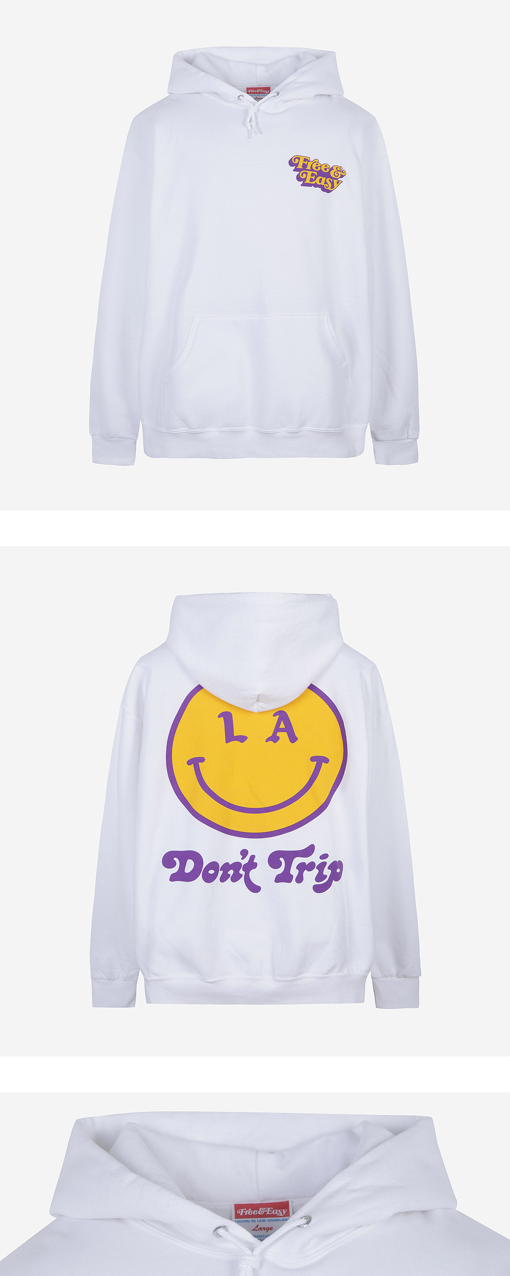 프리앤이지 (Free & Easy)는 LA에서 시작된 브랜드로 위트있는 'Don't Trip(넘어지지 마)' 문구 아래 캘리포니아의 자유로운 분위기를 담아냅니다. Pullover mid-weight hoodie. Classic P.E. style with a slightly cropped/vintage hoodie fit. Want a little more room? Size up. Want that OG feel? Get your normal size. Stay comfy! Color White Features • 50% cotton / 50% polyester • Kangaroo pocket • Matching drawstrings • Double needle construction • Vintage washed • Pre-shrunk • Hand-printed in Los Angeles • True to size