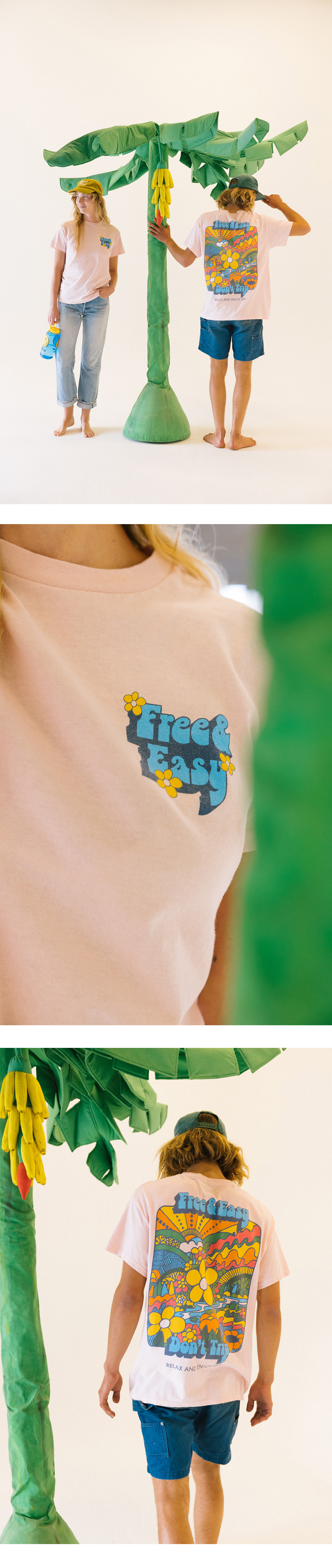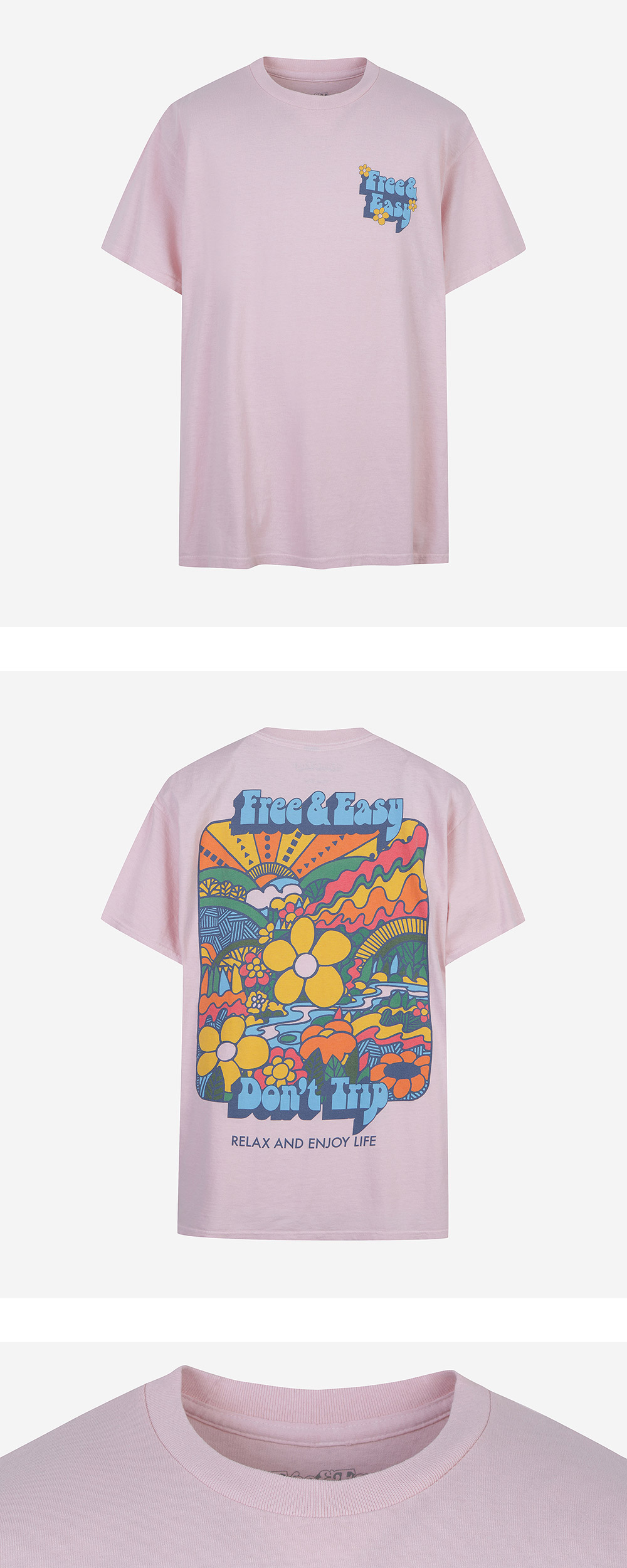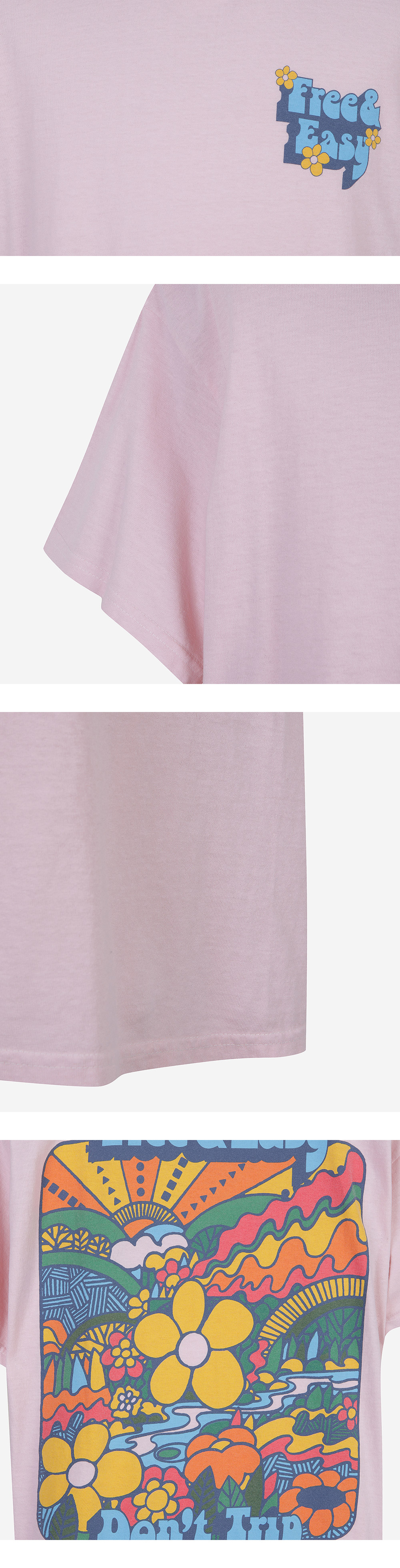 프리앤이지 (Free & Easy)는 LA에서 시작된 브랜드로 위트있는 'Don't Trip(넘어지지 마)' 문구 아래 캘리포니아의 자유로운 분위기를 담아냅니다. Color Pale Pink Features • 100% cotton • Double needle construction • Vintage washed • Pre-shrunk • Hand-printed in Los Angeles • Standard Size • Size up for relaxed fit