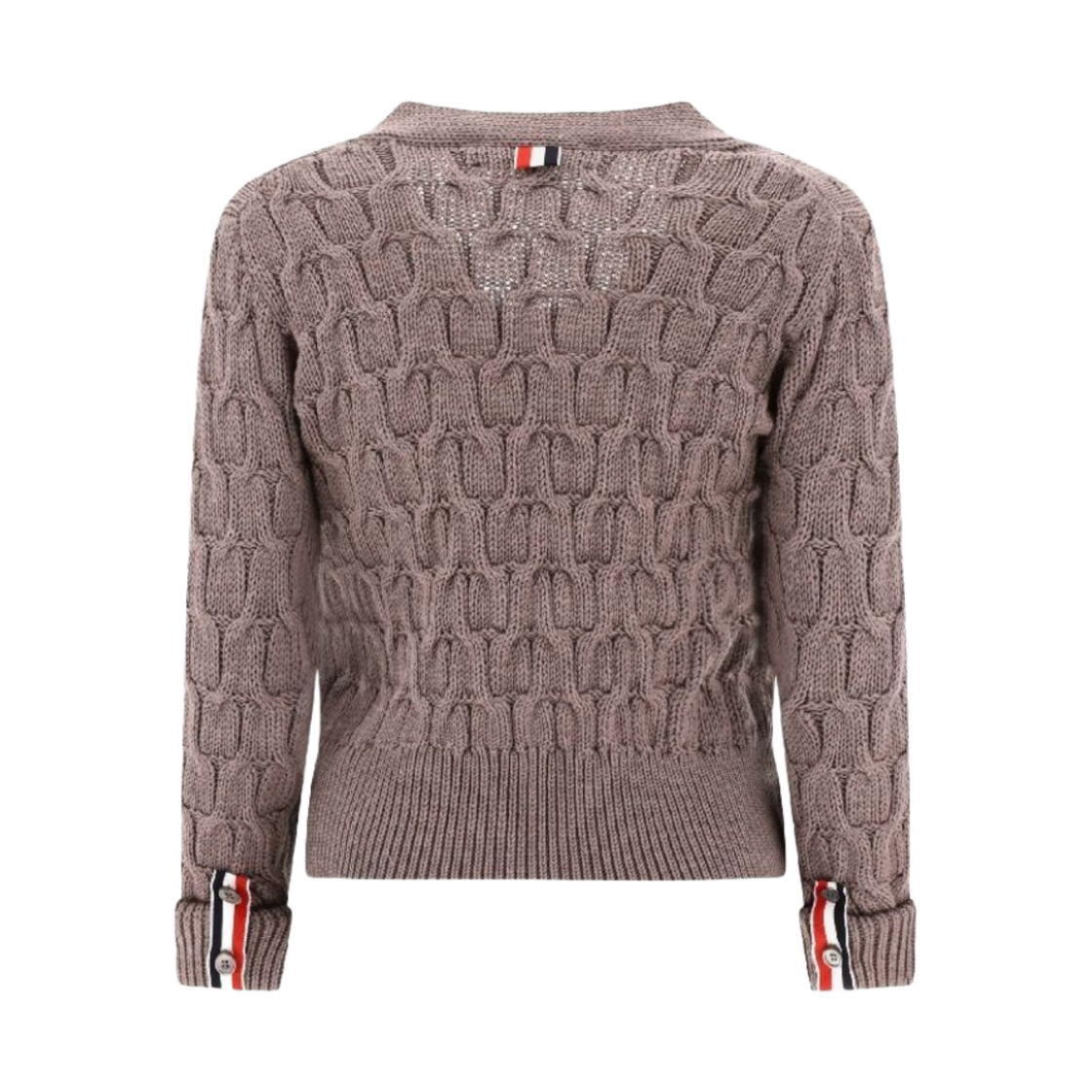 (W) Thom Browne Merino Wool Crisscross Cable Stitch 3/4 Sleeve V-Neck Cardigan Medium Brown