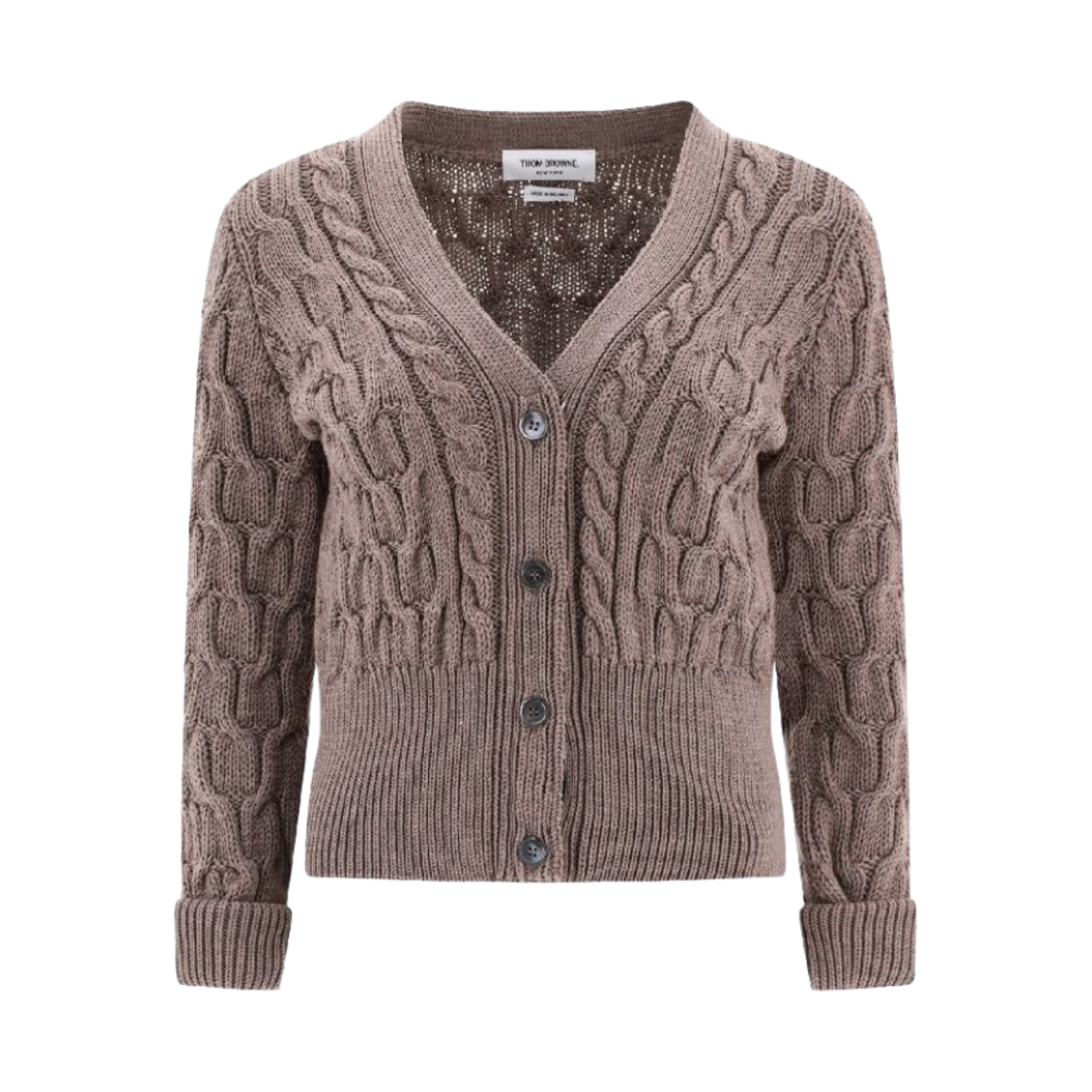 (W) 톰브라운 메리노 울 크리스크로스 케이블 스티치 3/4 슬리브 브이넥 가디건 미디움 브라운