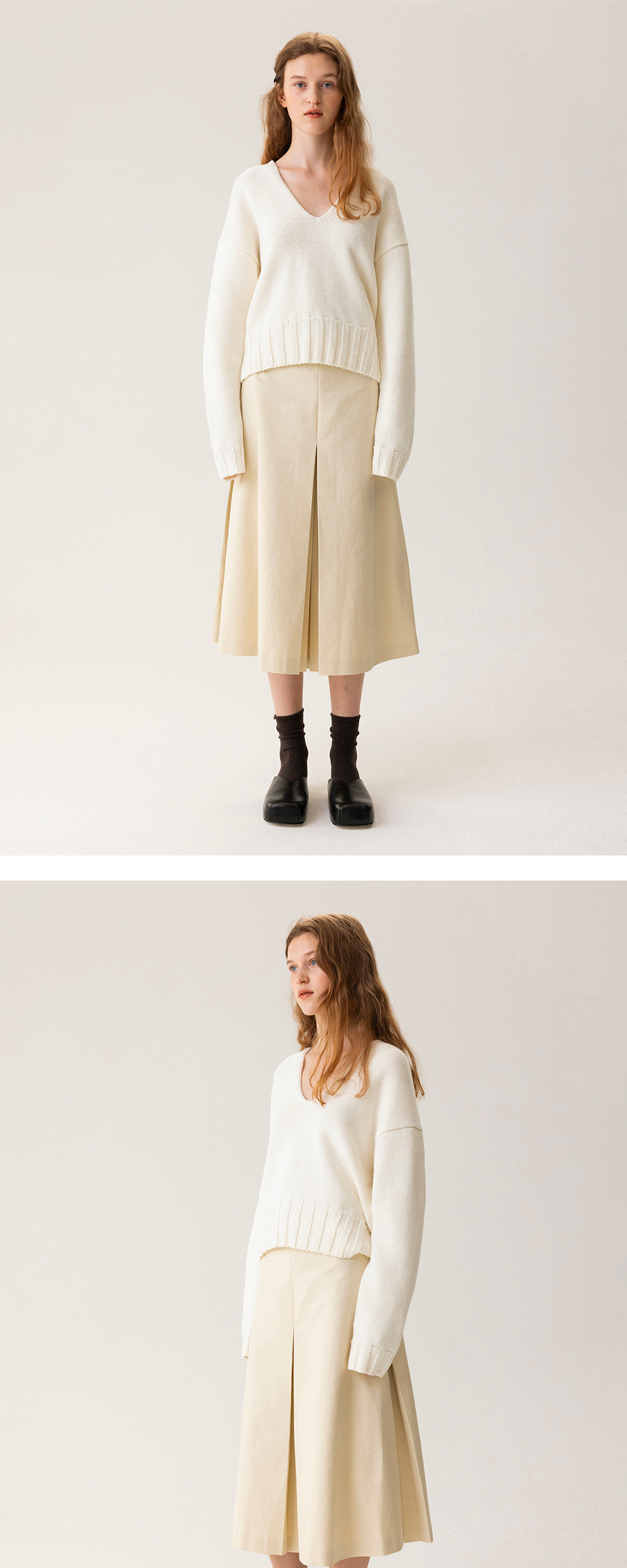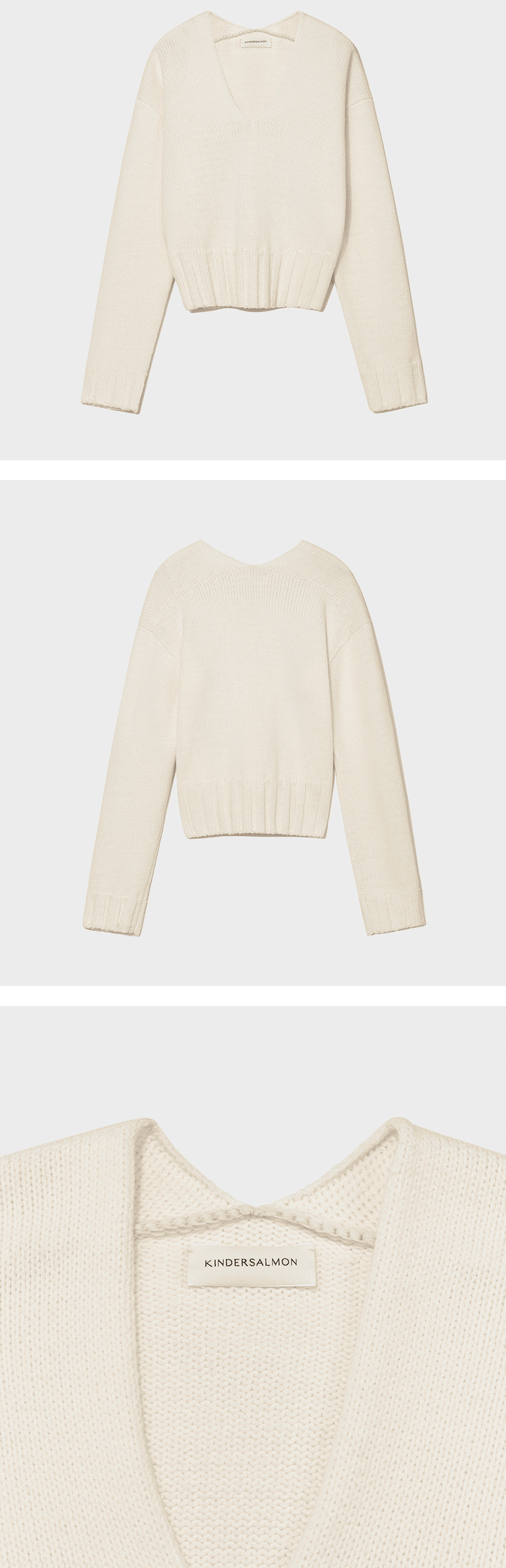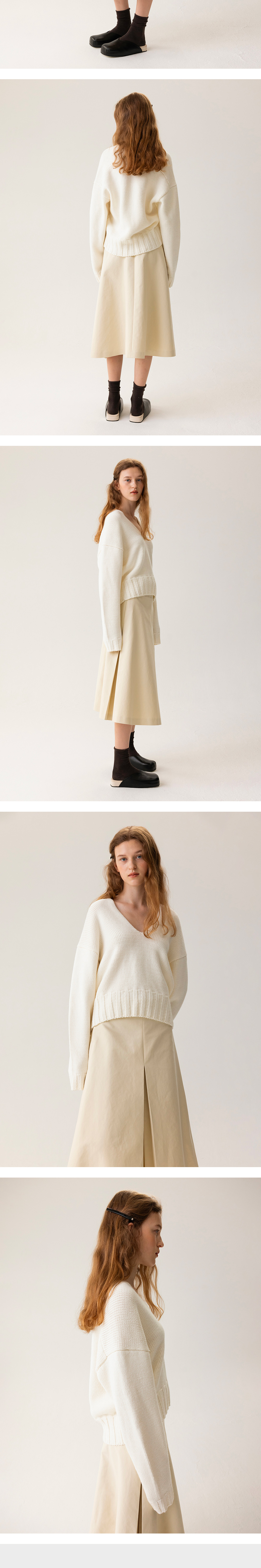 깊게 파인 브이넥에 살짝 여유 있는 핏으로 페미닌하면서도 편안한 느낌을 연출합니다. 약간 크롭 기장으로 제작되었으며, 면 소재로 부드러운 터치감이 특징입니다.