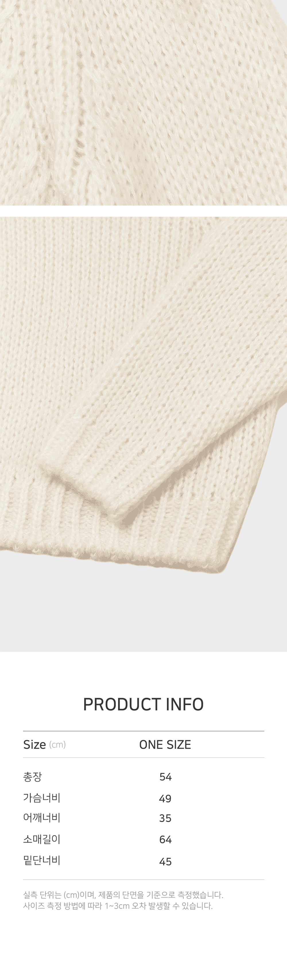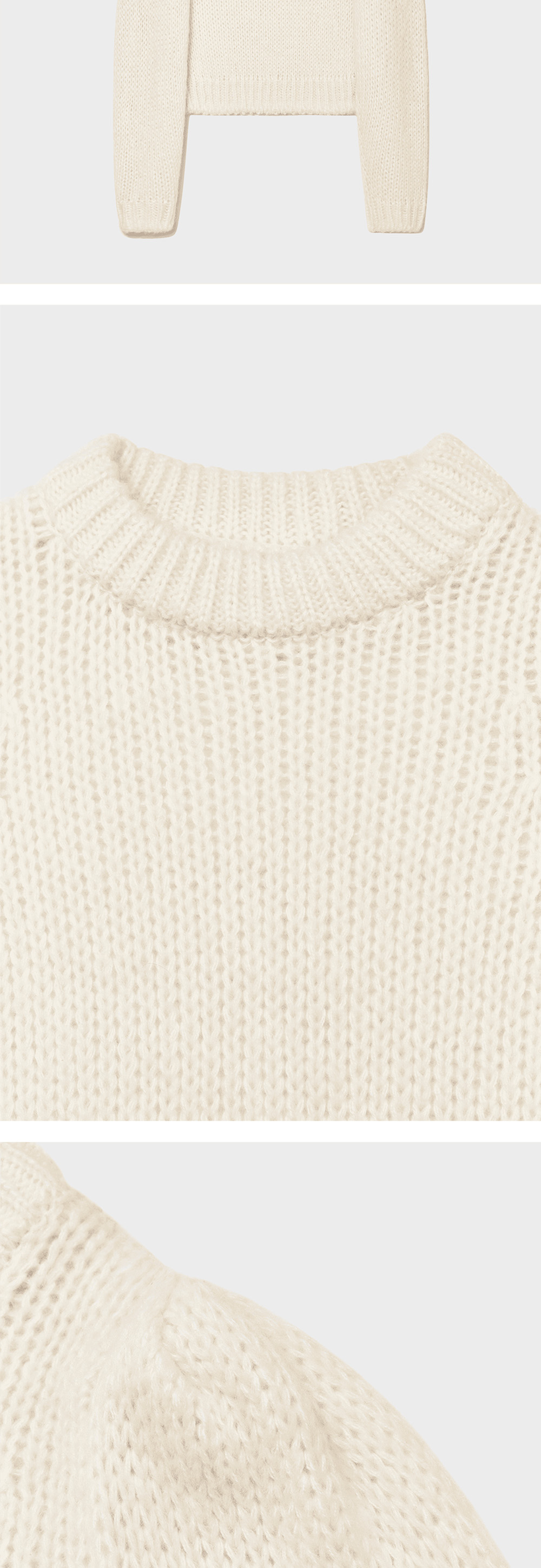 숄더 라인에 턱을 잡아 봉긋하게 올라오는 퍼프 슬리브로 러블리함이 돋보이는 니트 톱입니다. 약간의 성근 니트 짜임과 세미 크롭 기장으로 페미닌함을 완성시켰습니다. 비침이 약간 있습니다.