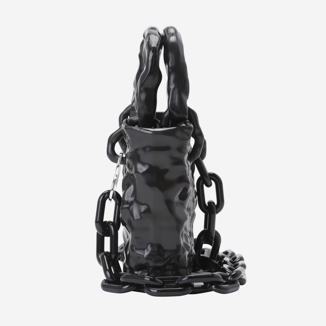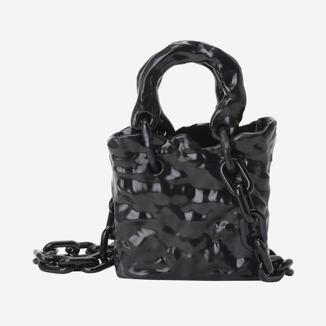Signature Ceramic Bag with Heart Chain Signature style. Ceramic-effect, black body. Double tonal handles. Metal heart with chains. Tonal debossed logo. Each bag has a unique structure. Dustbag and box included. 14.5cm x 13.5cm x 5cm. 100% Recycled Thermoplastic Polyurethane Designed in Berlin. Made in Greece.