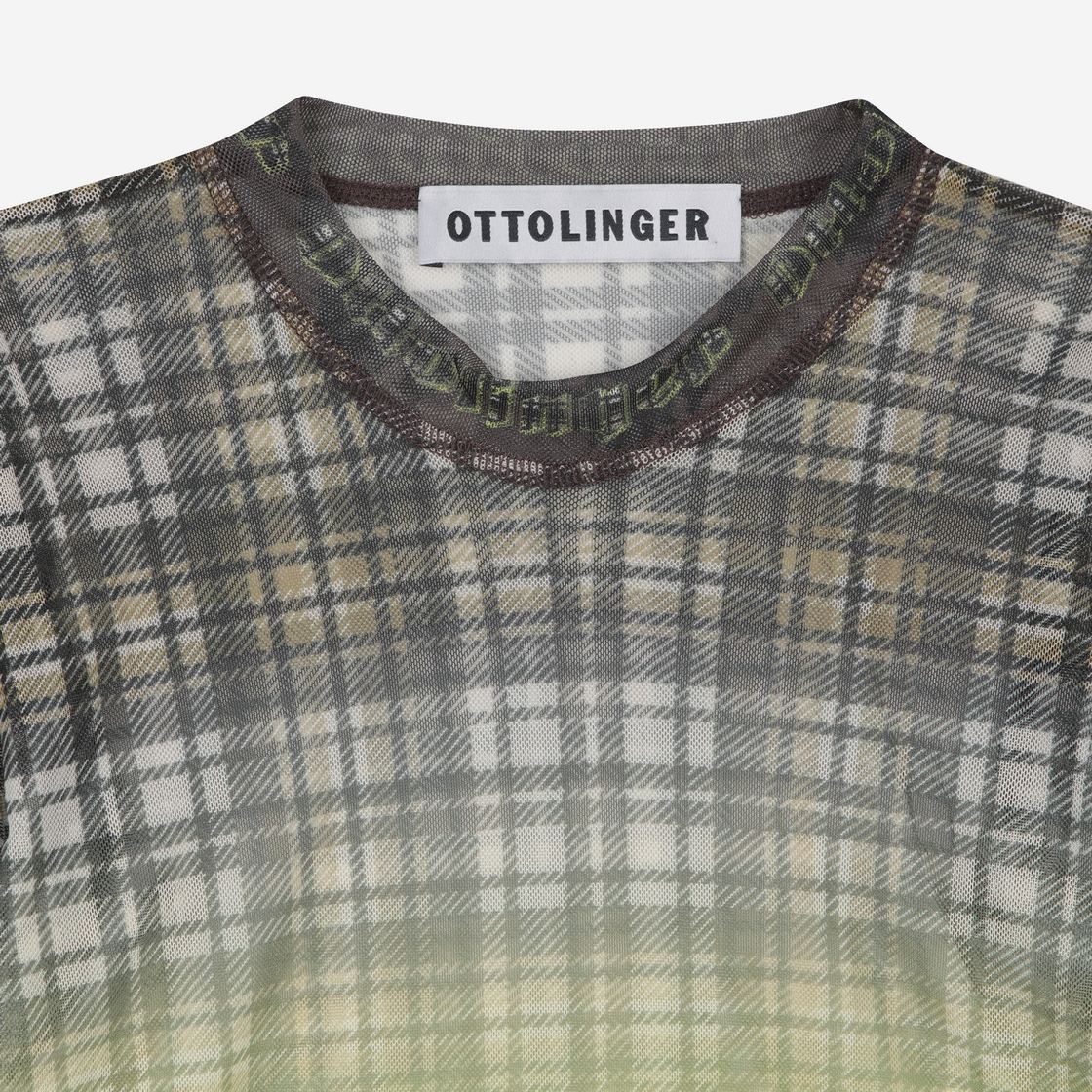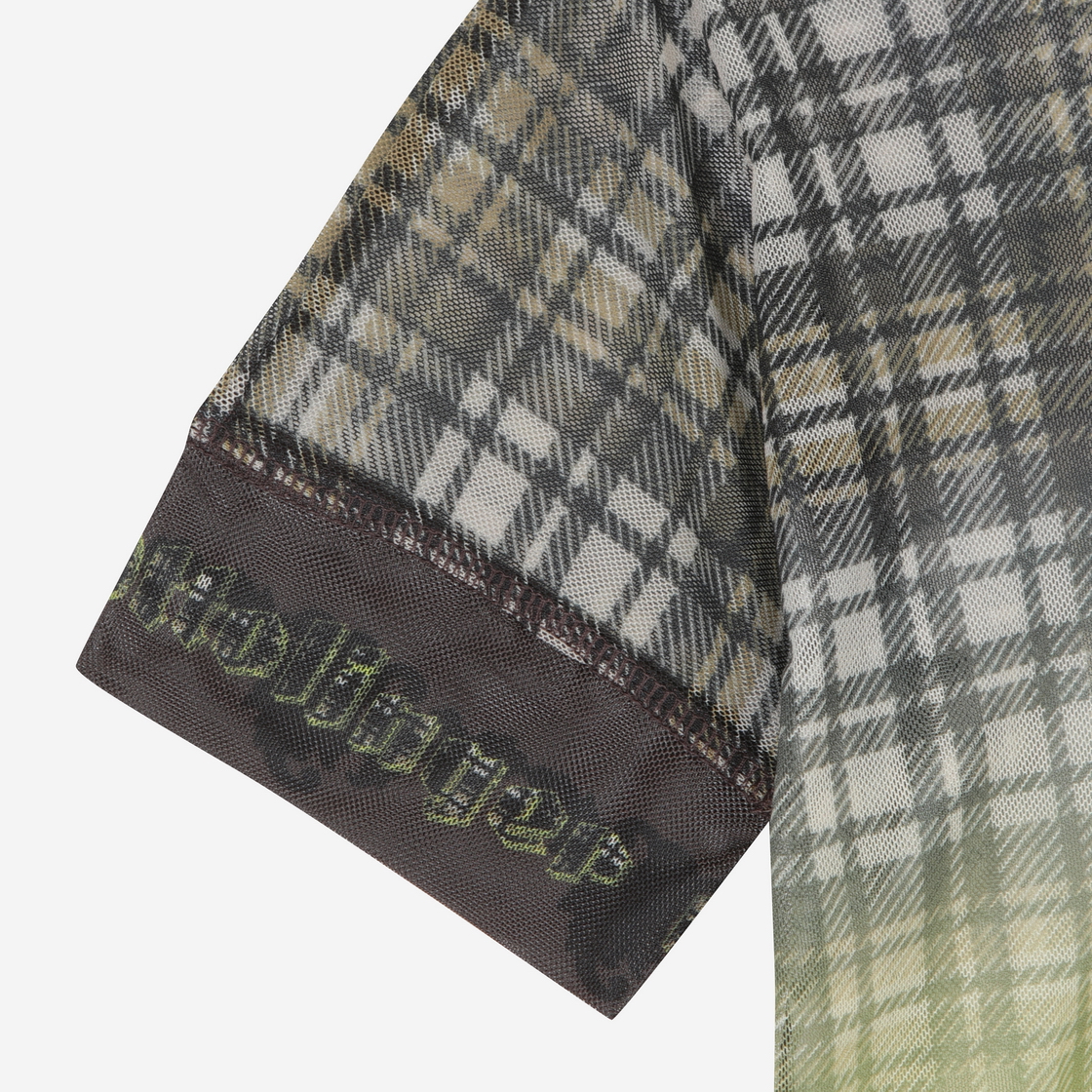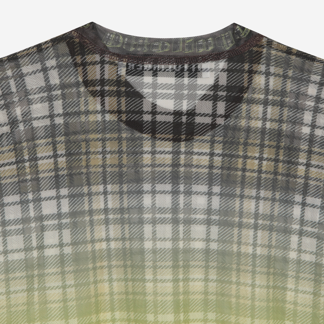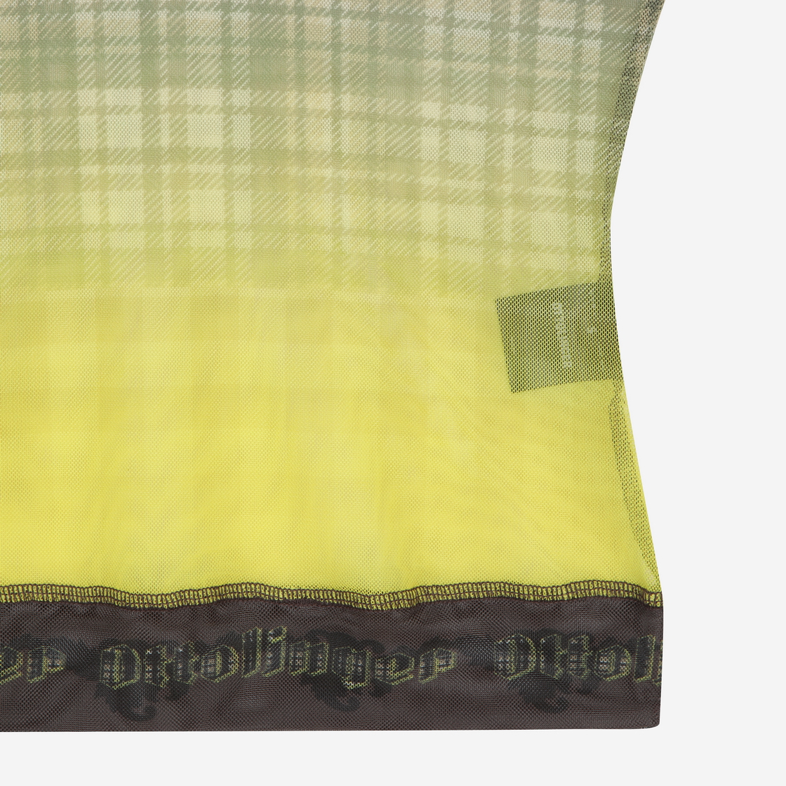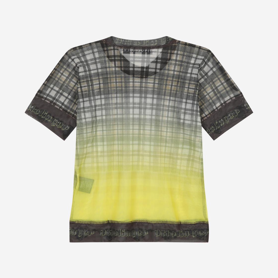 Recycled Mesh T-Shirt in Yellow Plaid Signature style. Printed logo collar, sleeve and hem. Printed pattern on recycled mesh. Semi-sheer. Cropped fit. Moderate stretch. Handwash cold. Model is 179cm and wears size S. 90% Recycled Polyester 10% Elastane Designed in Berlin. Made in Greece.
