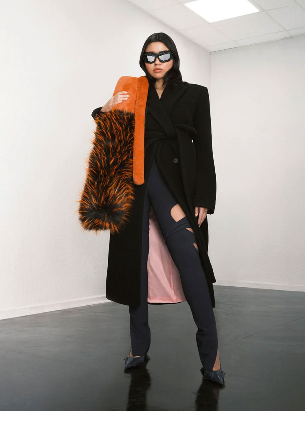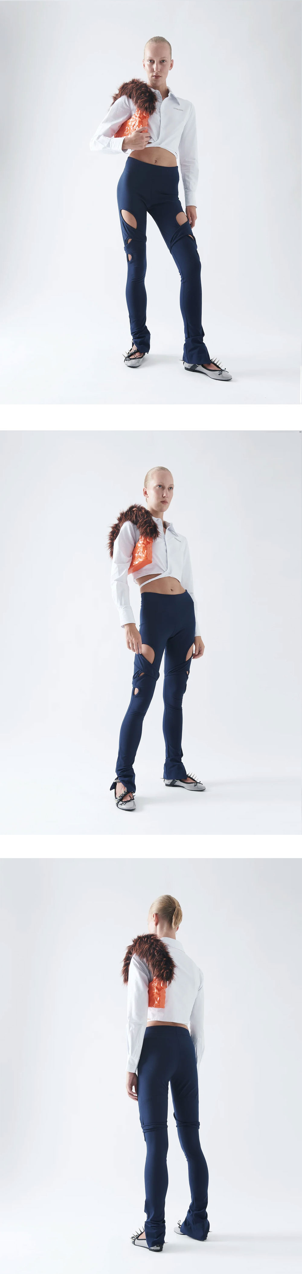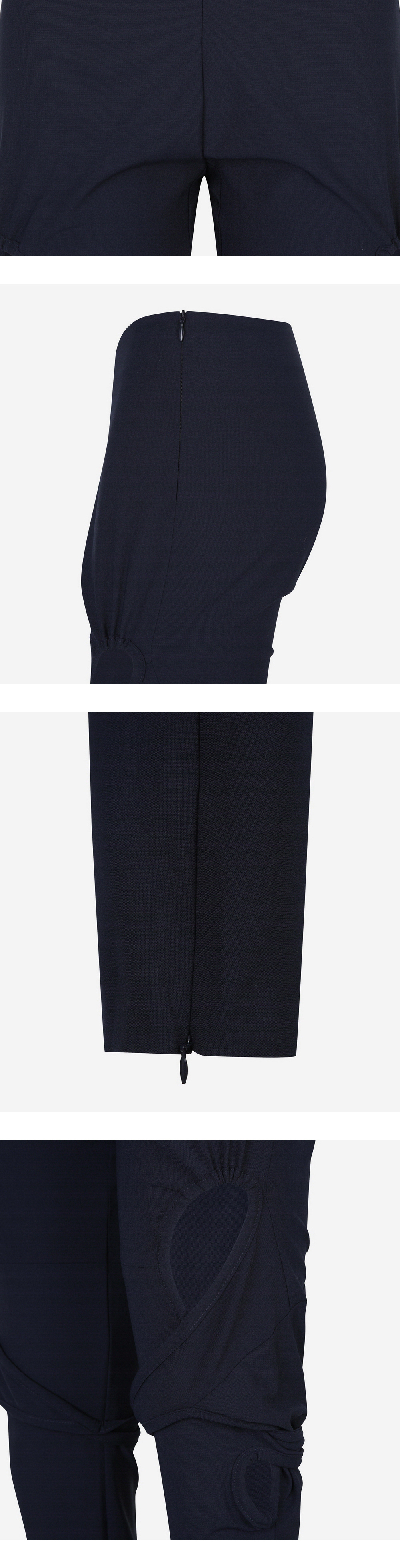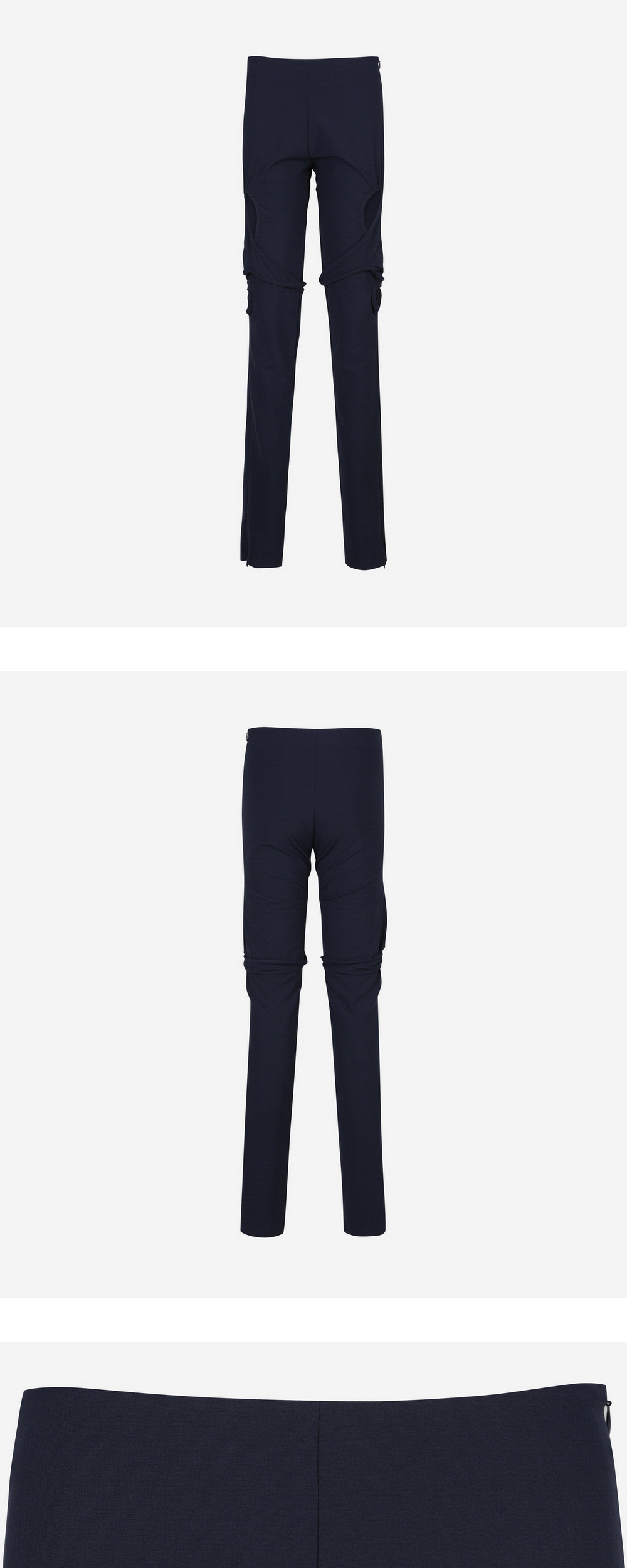 Fitted Loop Pants in Navy Self-tie, thigh straps. Hidden Zip-closure. Zip-opening at ankles. Little stretch. Delicate dry clean. Model is 179cm and wears size S. 53% Polyester 43% Virgin Wool 4% Elastane Designed in Berlin. Made in Poland.