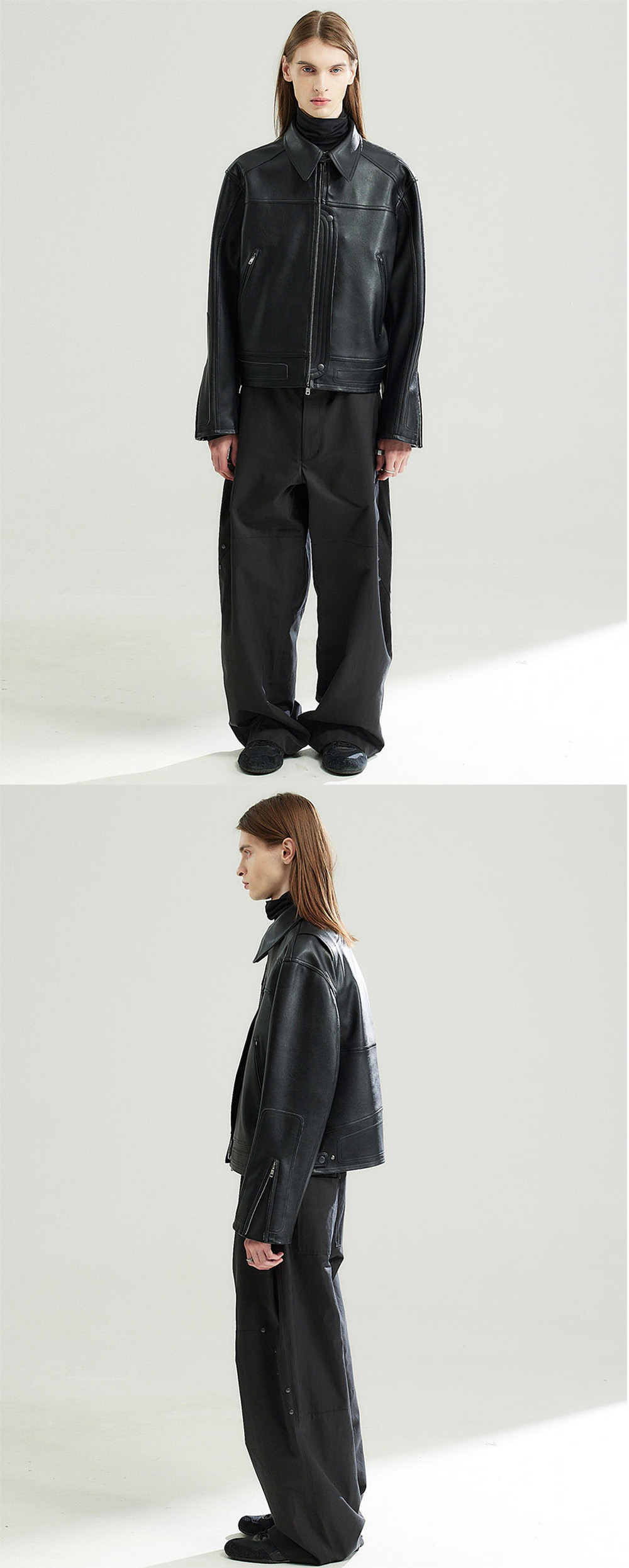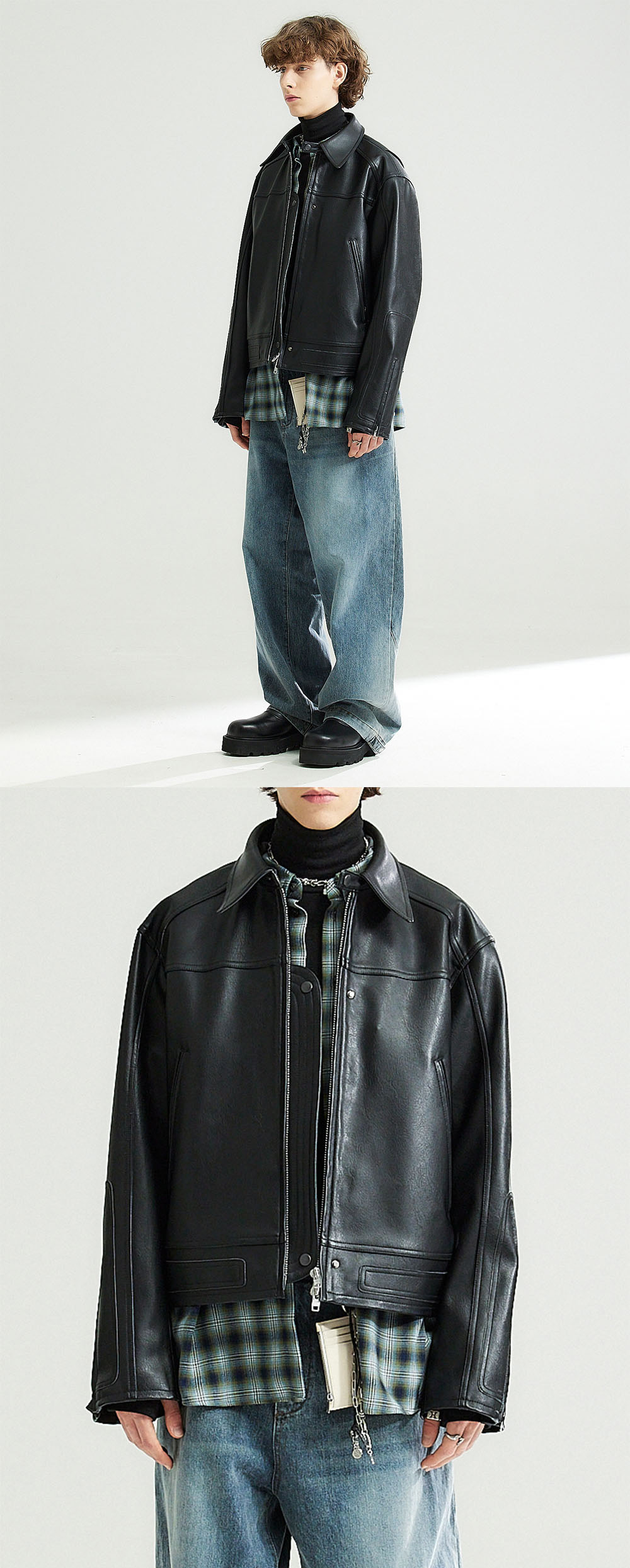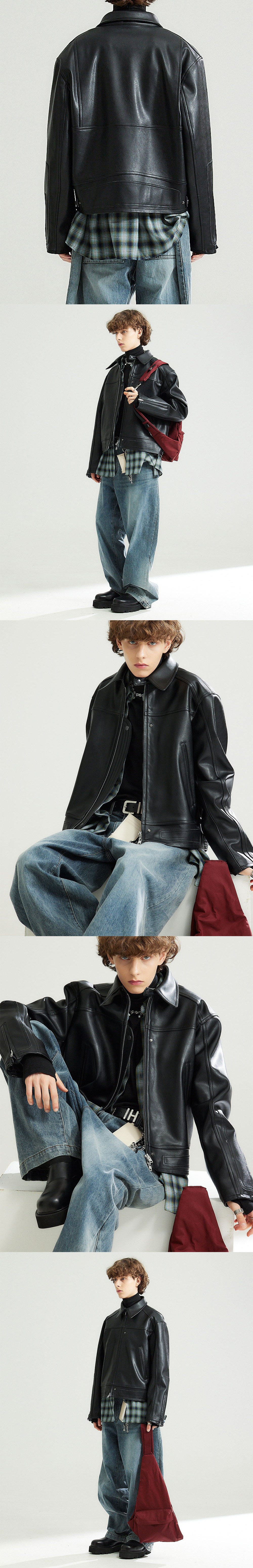 태닝 워싱 가공된 두껍고 빈티지한 느낌의 인조 가죽으로 제작된 레이싱 자켓입니다. 은은한 광이나는 소재로 고급스러운 느낌을 주며 입체적인 패치워크의 레이싱 디테일을 차용하여 유니크하고 트랜디하게 입기 좋은 제품입니다. -DETAIL- 레이싱 패치워크 차용 디테일 입체 절개 등판 액션 플라켓 디테일 스냅을 활용하여 플라켓을 앞으로 뺴서 연출 가능 디테일 -COMPOSITION- 폴리우레탄 100% YKK 2way 지퍼(일본 수입)/YKK 스냅(일본 수입) 안감-폴리에스테르 100% 세탁-드라이 클리닝 -model- midhair model 181/61 2사이즈 착용 midlonghair model 187/67 2사이즈 착용 longhair model 184/64 2사이즈 착용