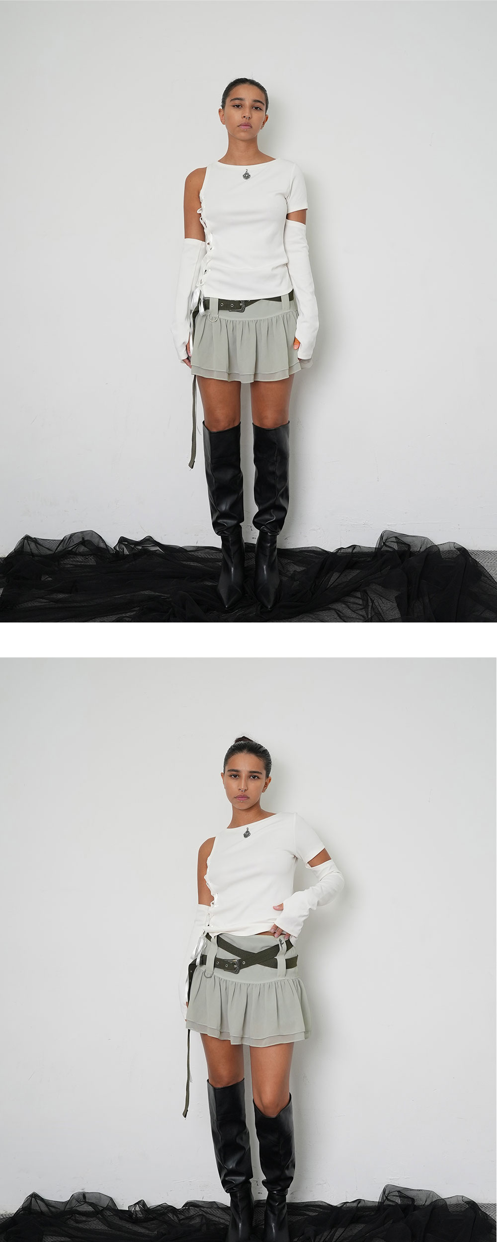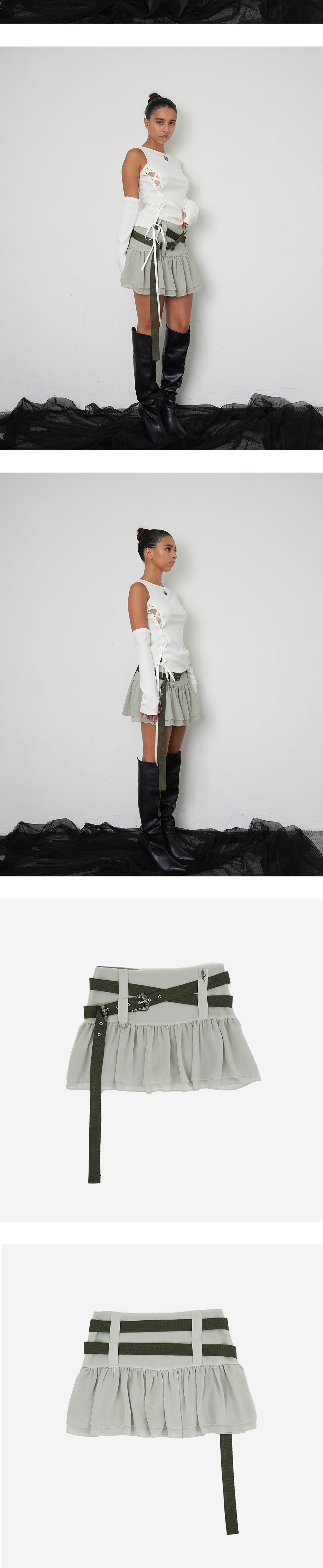 가볍고 하늘하늘한 쉬폰 원단/ 속바지 내장/ 로우라이즈 핏/ 벨트로 허리 조절가능/ 웨스턴 벨트 깡/ 써지컬 스틸 장미 펜던트 포인트/ 지퍼있음 * SIZE 2는 리오더 중으로 10/11 이후 순차발송 됩니다.