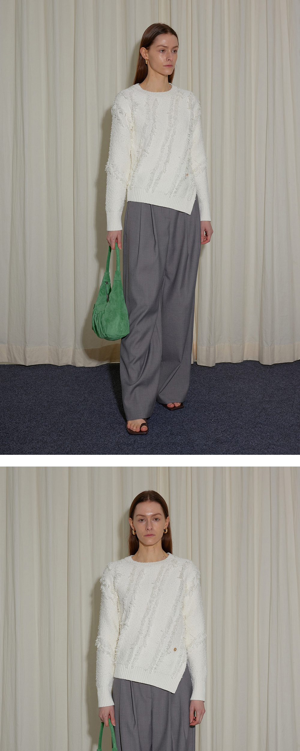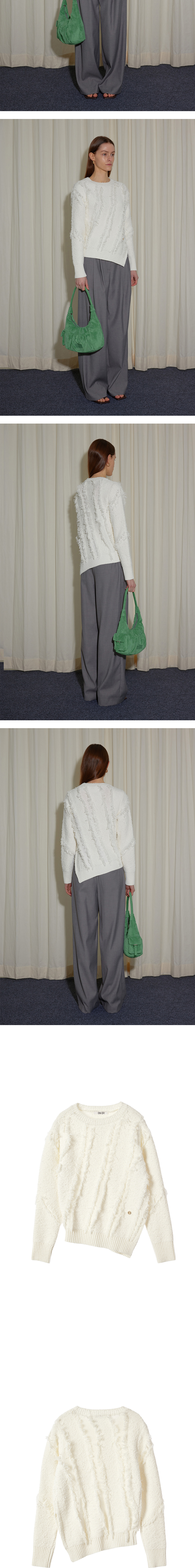 - 사선으로 떨어지는 사이드 절개라인이 매력적인 니트입니다. - 앞,뒤 몸판과 소매에 사선 절개라인 수술 디테일 포인트가 돋보입니다. - 하단 엔오르 심볼 금속 라벨로 완성도를 높였습니다.