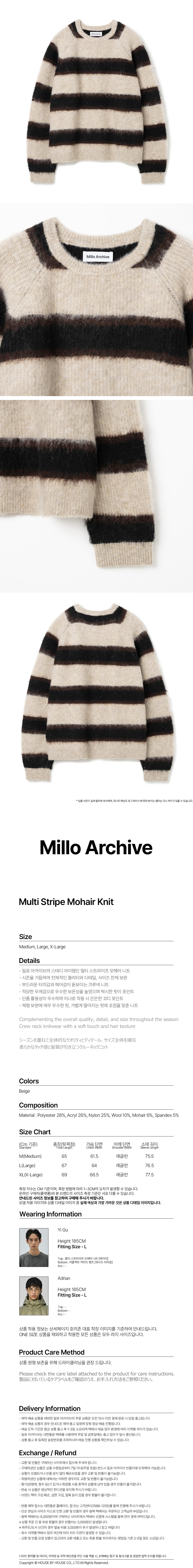 - 밀로의 새로운 모헤어 니트 라인의 상품 - 부드러운 터치감과 헤어감이 돋보이는 크루넥 니트 - 적당한 두께감으로 보온성을 높였으며 박시한 핏이 특징 - 이너로 착용 시 은은한 포인트가 될 수 있음 - 독보적인 스트라이프 디테일 배열로 완성도 높은 니트 - 가볍게 떨어지는 핏에 초첨을 맞춘 니트 - 단품으로 착용 시 깔끔하면서도 매력적인 포인트가 되는 연출 가능 - 니트웨어만을 전문으로 생산하는 공장에서 제작하여 훌륭한 마감 퀄리티