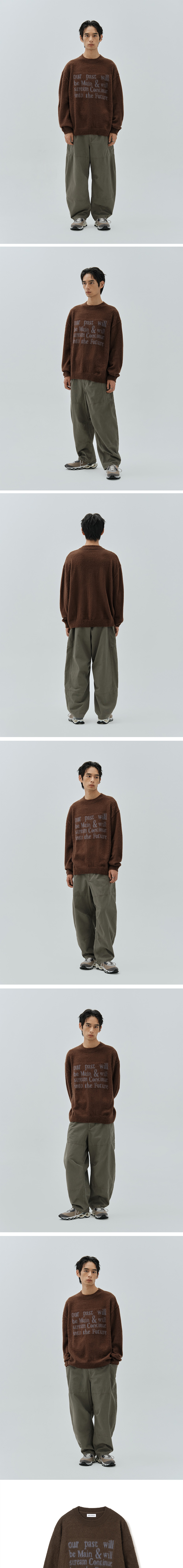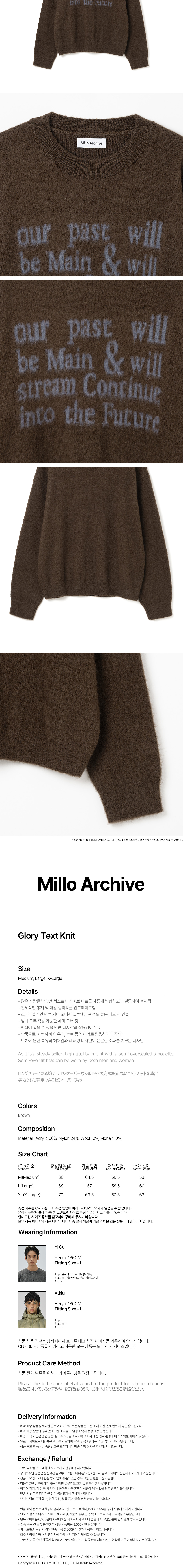 - 많은 사랑을 받았던 텍스트 아카이브 니트를 새롭게 변형하고 디벨롭하여 출시됨 - 밀로의 시즌 슬로건인 MAIN STREAM을 문장으로 풀어내 텍스트 워딩 하여 조화를 이루고 안정적인 텍스트 그래픽이 특징 - 전체적인 봉제 및 마감 퀄리티를 업그레이드함 - 스테디셀러인 만큼 세미 오버한 실루엣의 완성도 높은 니트 핏 연출 - 남녀 모두 착용 가능한 세미 오버 핏 - 맨살에 입을 수 있을 만큼 터치감과 착용감이 우수 - 단품으로 또는 헤비 아우터, 코트 등의 이너로 활용하기에 적합 - 모헤어 원단 특유의 헤어감과 레터링 디자인이 은은한 조화를 이루는 디자인