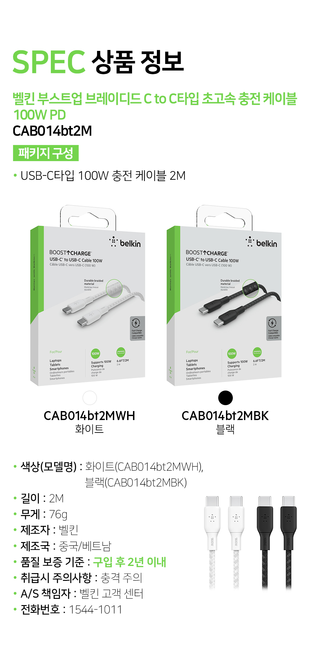 벨킨 브레이디드 C to C타입 초고속 충전 케이블 100W PD 2미터 CAB014bt2M 블랙
