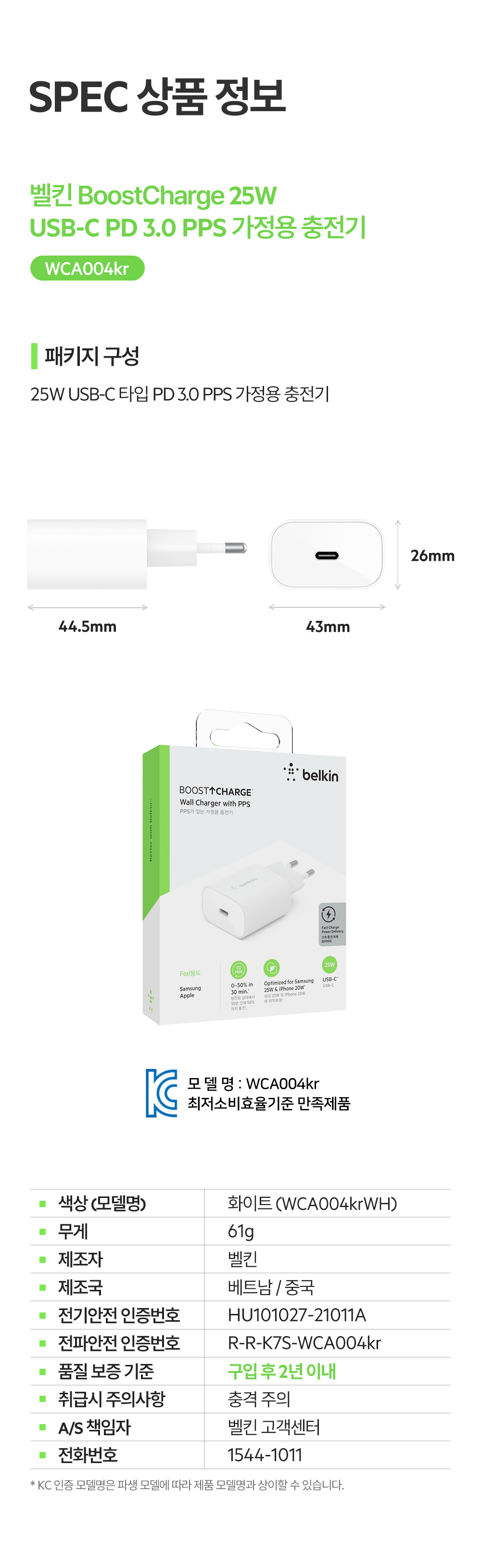 벨킨 25W PD 3.0 PPS C타입 초고속 충전기 WCA004