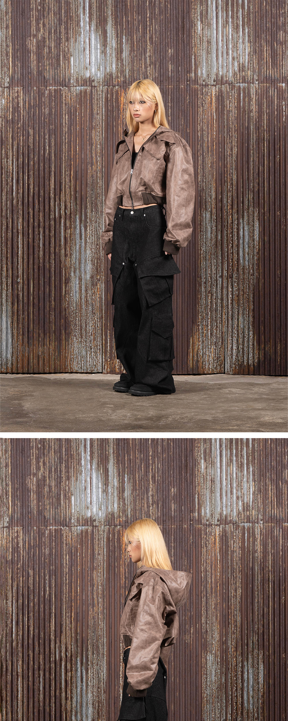 풀오브썬 후드 카고 크롭 레더 자켓 브라운