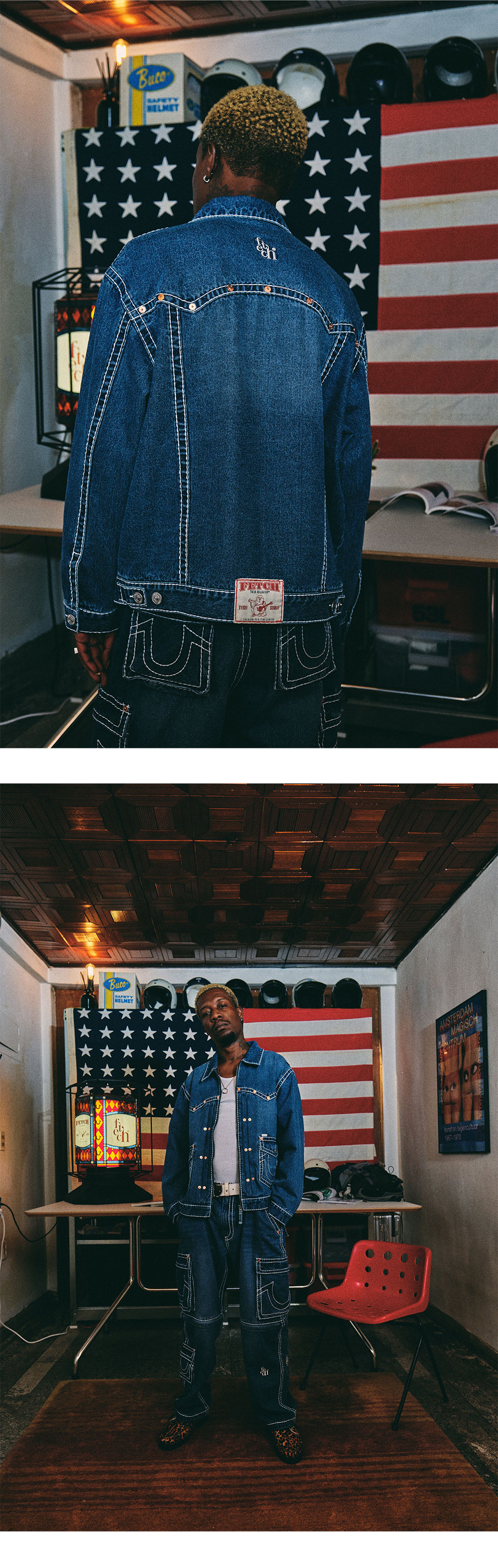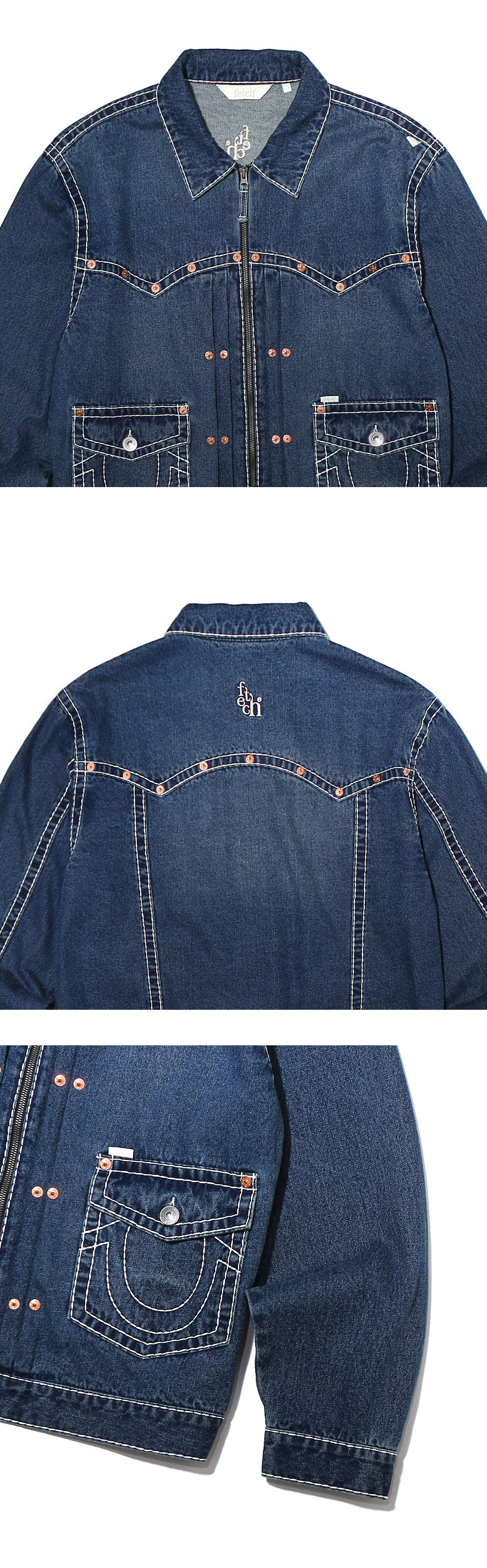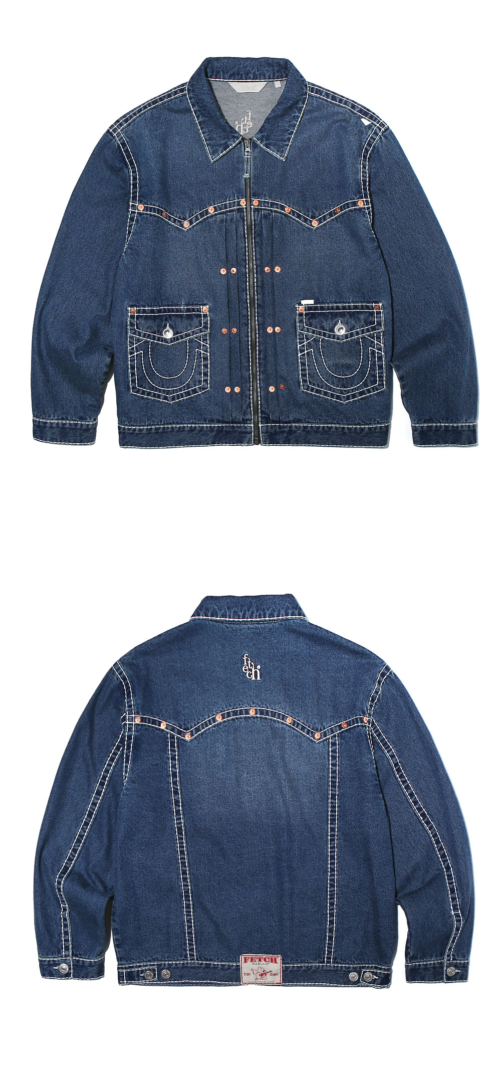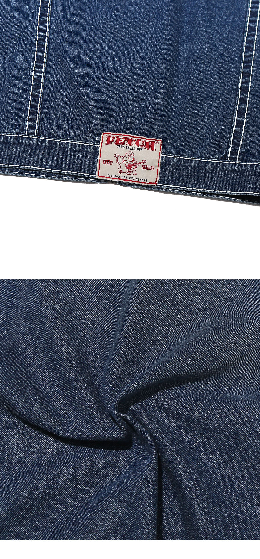 13OZ DENIM (Weaving for fetch) Material : Cotton 100% Stone bio washing finished Original True Religion Big-T Stitch Detail YKK fastener (METALUXE®) Original True Religion Stud Detail Fetch®Logo embroidery Fetch® X True Religion® Collraboration Label