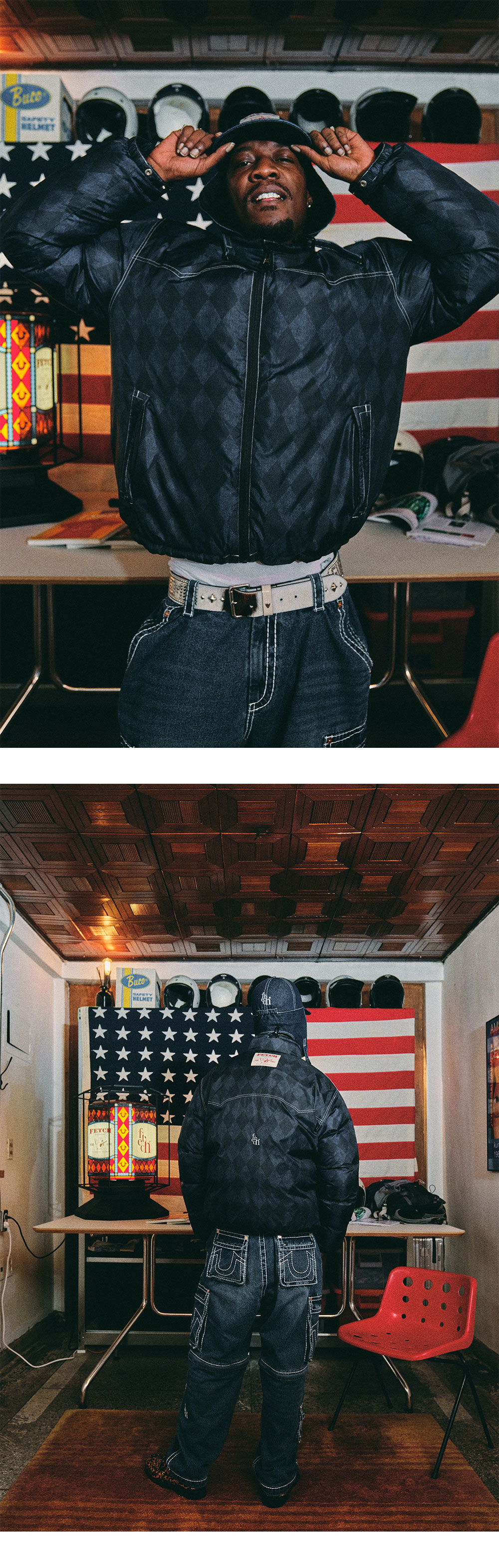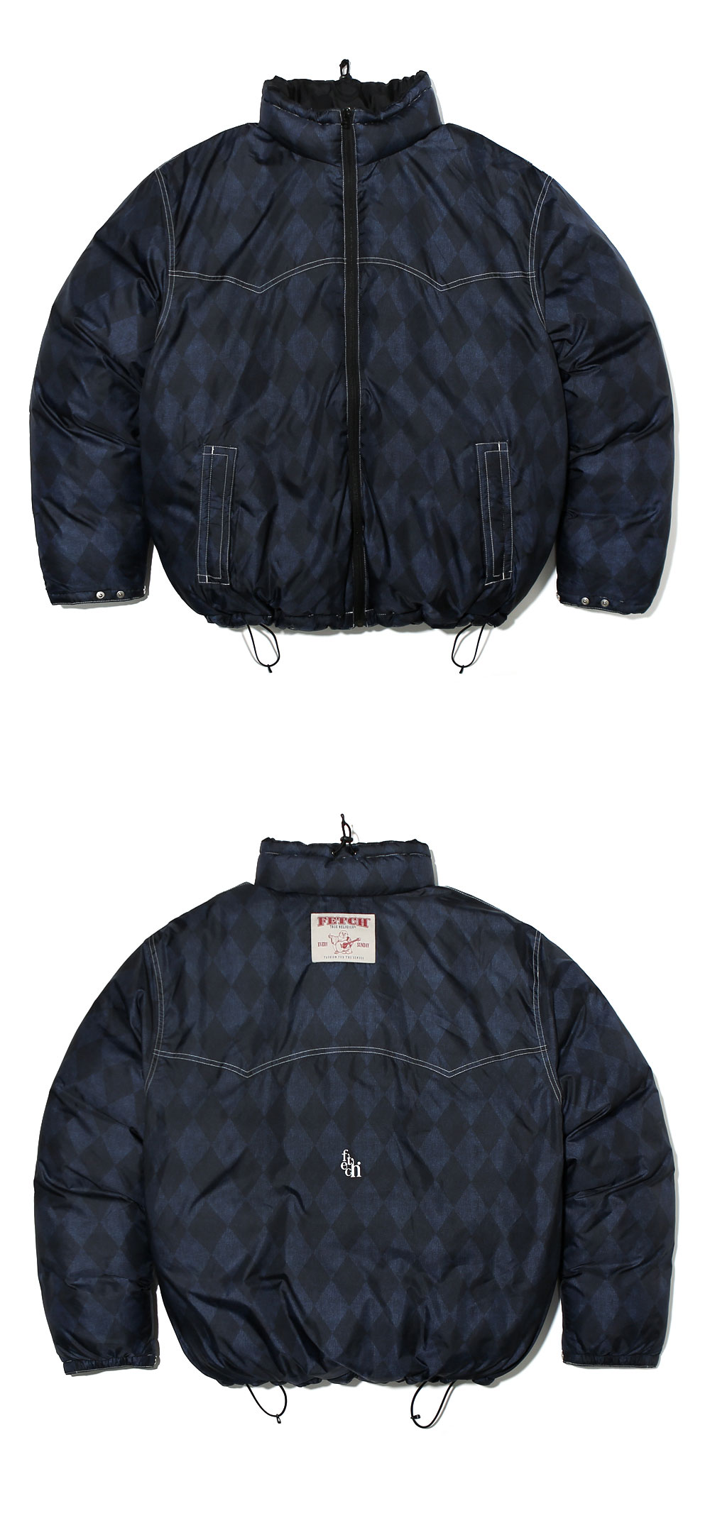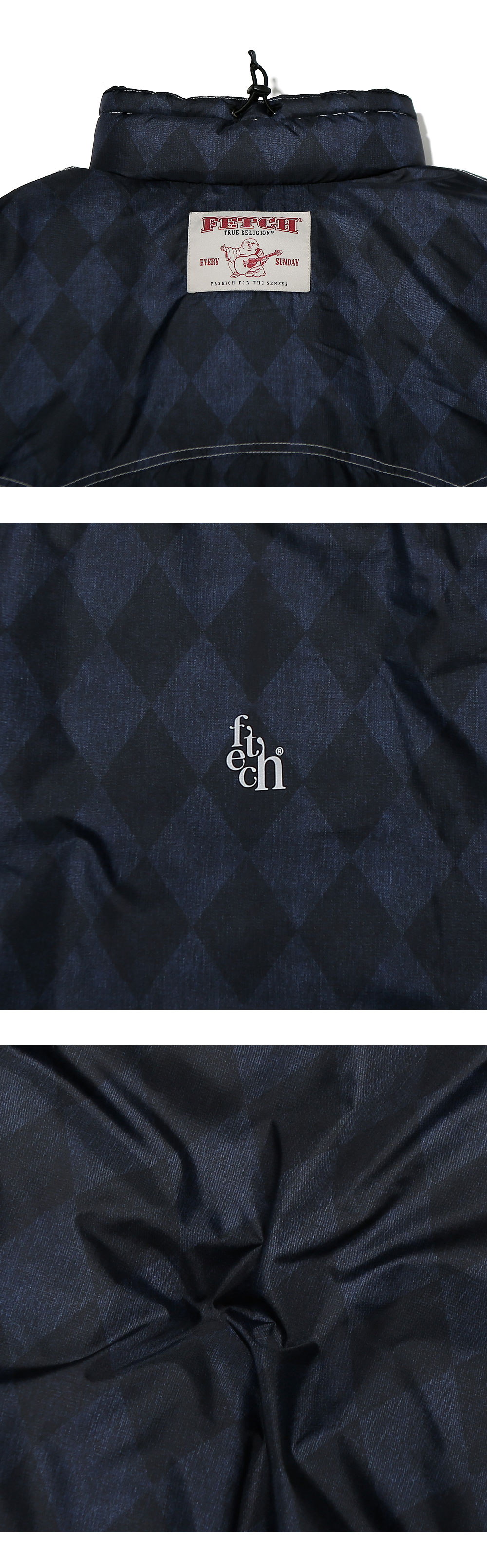 30D RIPSTOP DWR DOUBLE CIRE FINISH Polish white goose down FP 820-850 Material : Polyester 100% (Weaving for fetch) Filling : down 90% feather 10% (Polish white goose down) Original Checker Pattern Printed 3M® Reflective Fetch®Logo Printed Fetch® X True Religion® Collraboration Label YKK fastener (COIL) YKK® Michel Spring Snap