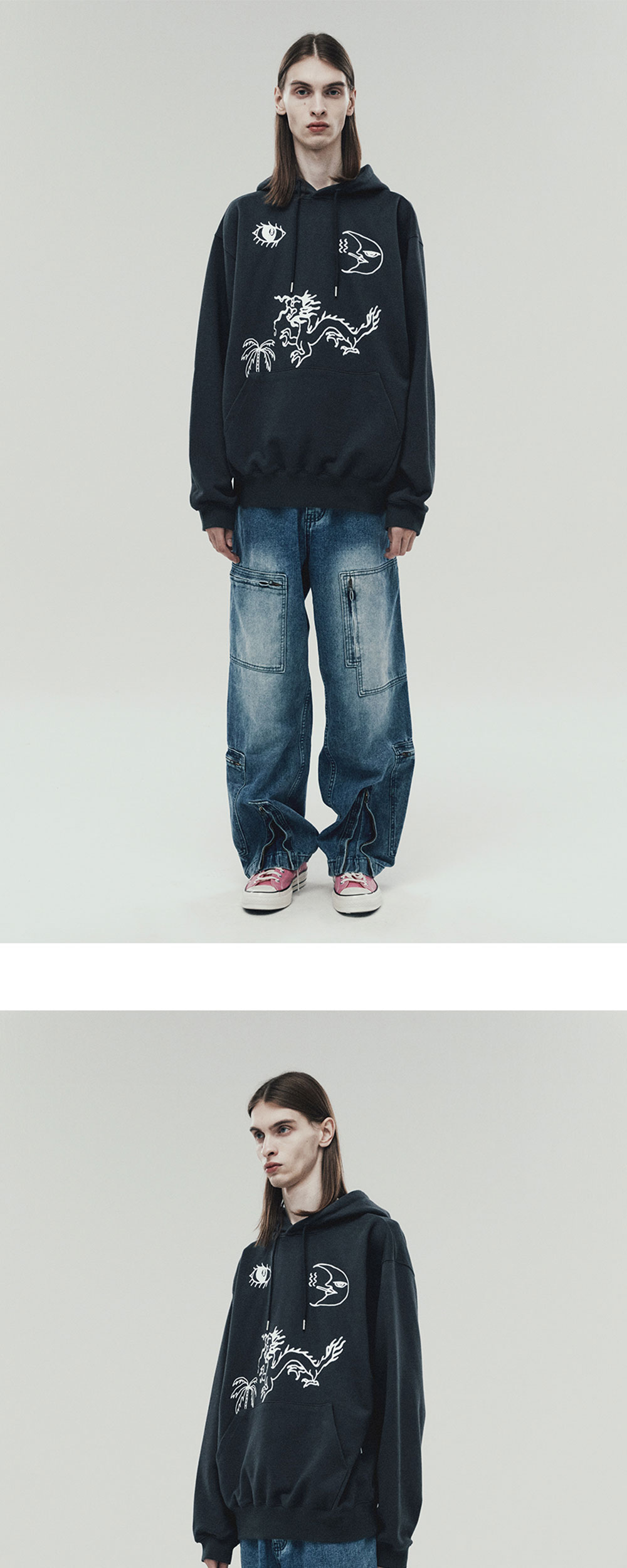 해당 제품은 앞판에 날염 프린트 후 후드 주머니를 봉제한 제품으로 후드주머니에 날염이 가리는 분량은 사이즈 별로 상세컷과 차이날 수 있습니다.