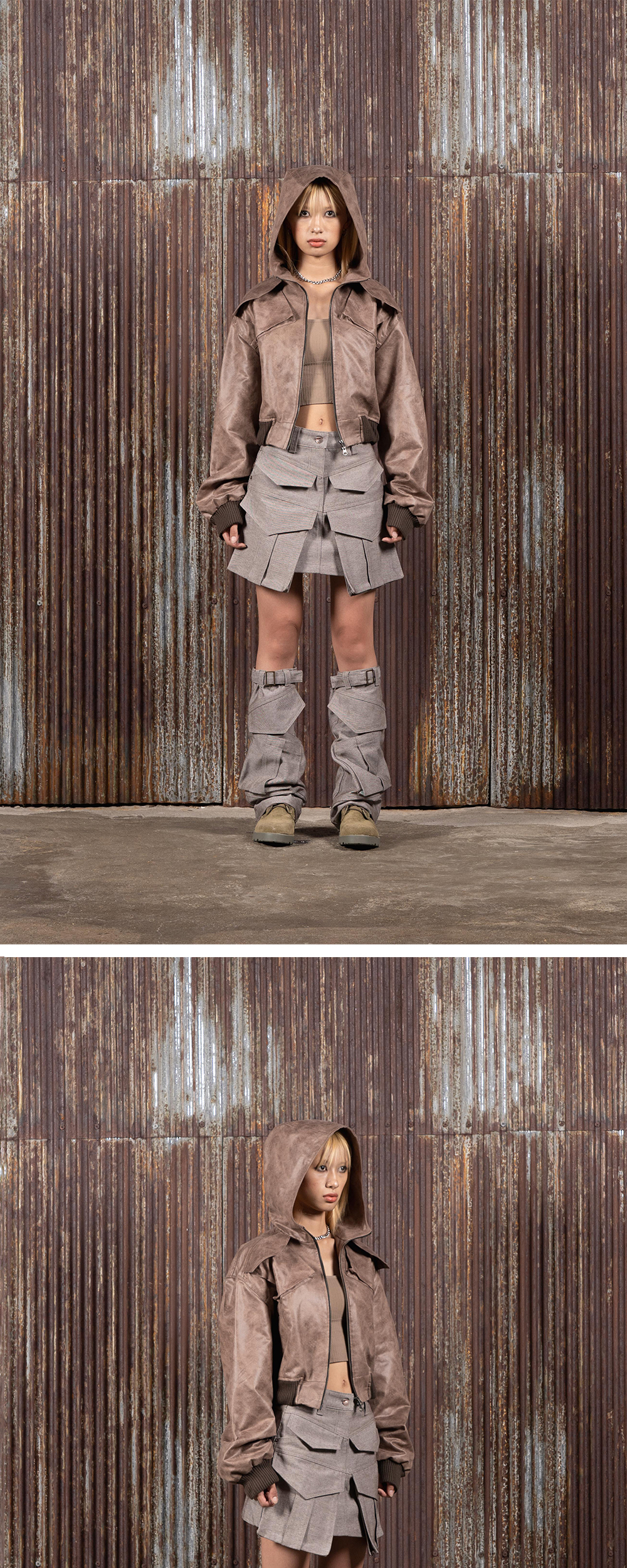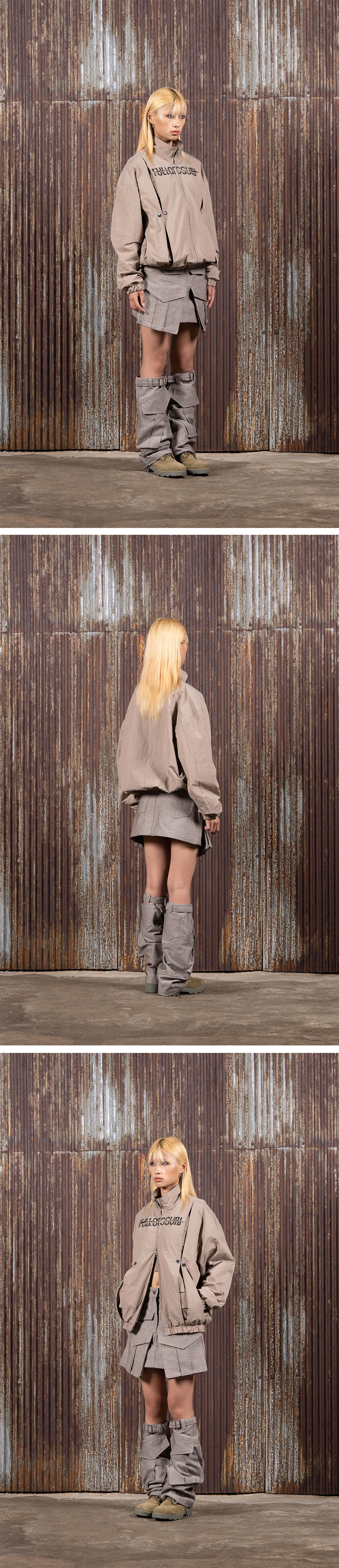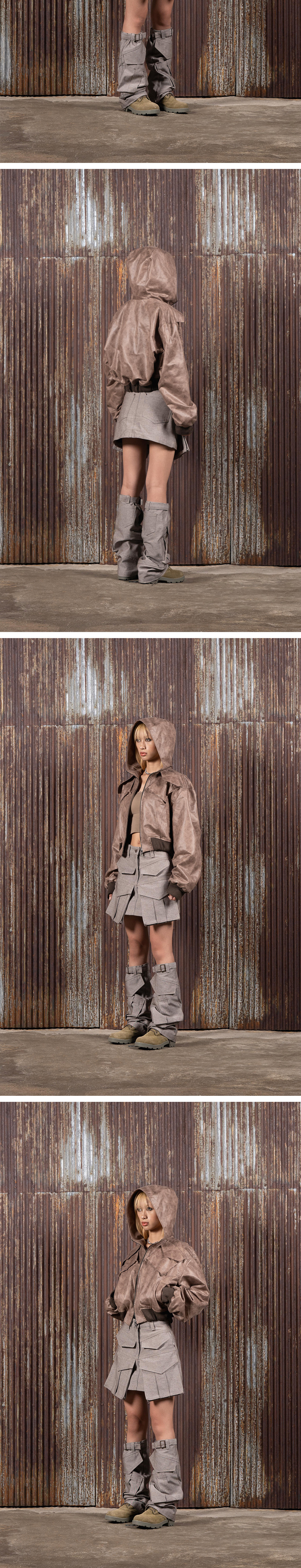 풀오브썬 컷아웃 데님 미니 스커트 레그 워머 세트 브라운 화이트