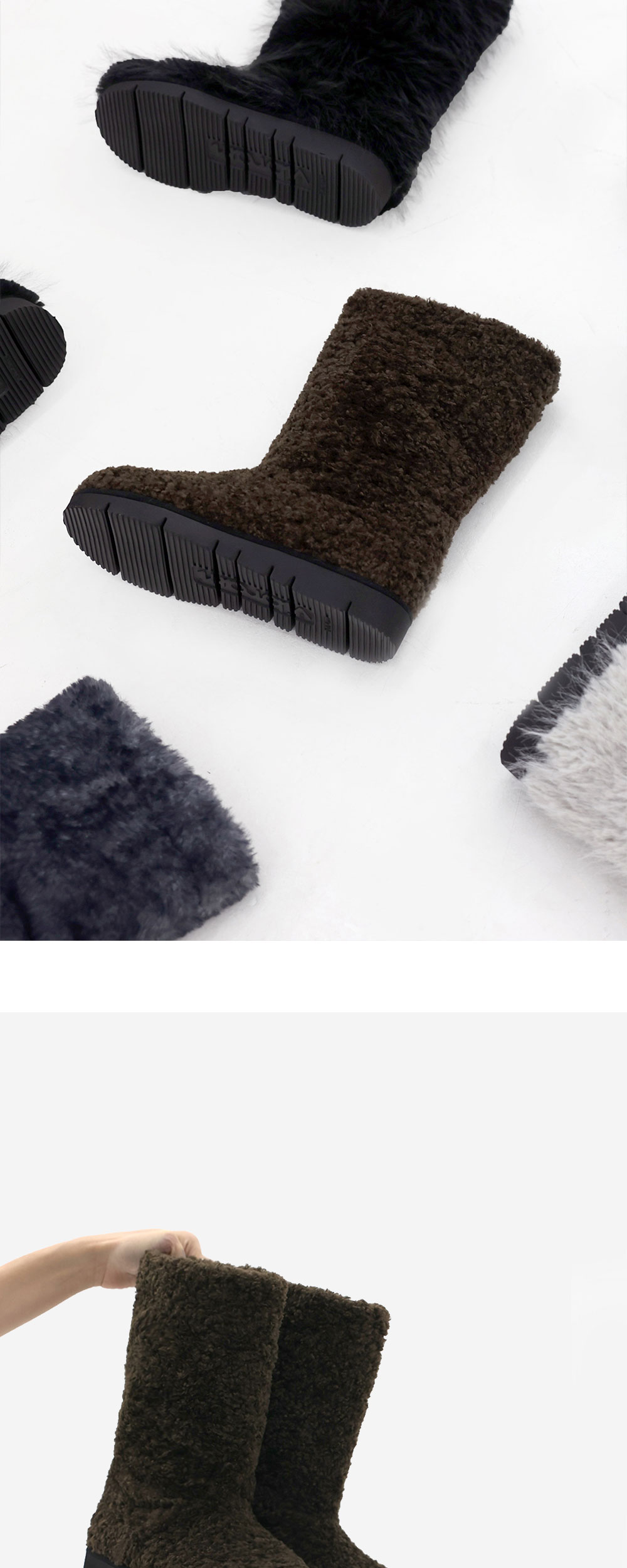 * 슈즈류는 1:1 주문제작으로 단순변심에 의한 교환 및 환불이 불가능합니다. * 슈즈류는 1:1 주문제작으로 7-14일 소요되는 점 참고부탁드립니다. FO FO HAIRY BOOTS는 4가지 컬러로 구성되어있으며 컬러 별로 사용된 소재가 다릅니다. 사용한 원단은 Polyester 100%로, 포포 부츠에 사용된 4컬러 군의 퍼 중 가장 단모의 퍼를 사용했습니다. 퍼의 길이가 짧고 컬러가 어두운 편으로 가장 오염에 강한 원단감입니다. 볼륨감 있게 둥근 앞 코와 부드럽게 이어지는 발등 실루엣으로 앞 코가 퍼의 풍성함을 더욱 돋보일 수 있게 라인을 수정하였고, 자칫 한 덩어리처럼 보이지 않도록 입구 위에는 스티치를 주어 단조롭지 않게 마감했습니다. 또한 안감은 겉감과 동일한 퍼 원단을 사용하여 부드럽고 따듯한 착용감을 느끼실 수 있습니다.