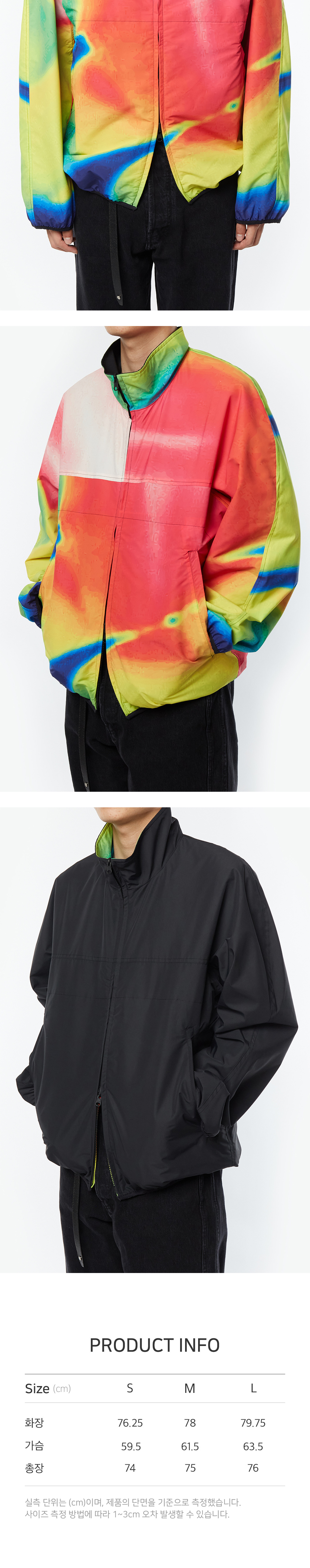 타이핑미스테이크와 인세인개러지의 콜라보레이션 제품입니다. 블랙 솔리드 사이드와 열화상 디지털 프린팅 사이드의 리버시블 윈드브레이커 모델로 놈코어 무드와 유니크한 무드를 다양하게 스타일링할 수 있는 제품입니다. 타이핑미스테이크의 디자인 디렉터 손을 직접 열화상 카메라로 촬영하고 이를 디지털 프린팅한 위트 있는 디자인이 특징인 모델입니다. 가을 겨울에 아우터 또는 이너 레이어드로 모두 활용 가능한 여유로운 핏과 볼륨감으로 웨어러블하게 입기 좋습니다. 생활 방수 기능은 물론 넉넉한 소매와 편안한 감촉으로 착용감이 뛰어납니다. 양쪽으로 4포켓 디테일을 가미하여 수납 활용이 좋으며, 2WAY 지퍼를 사용해 다양한 연출이 가능합니다. 열화상 디지털 프린팅 사이드의 주머니는 지퍼 오프닝 방식이 아닙니다. 참고 부탁드립니다. - MODEL 178CM, 64KG, WEARING M SIZE