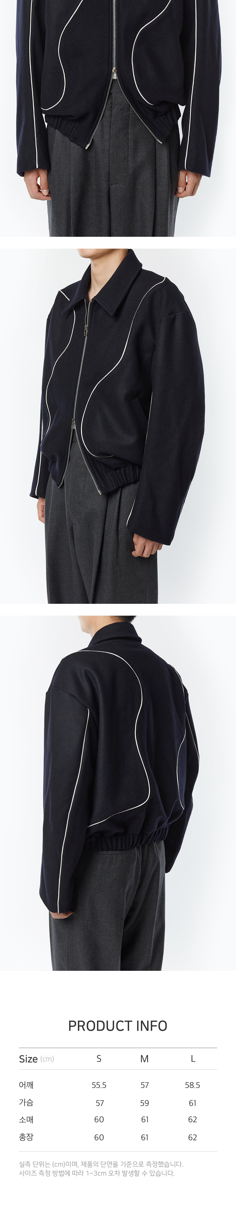 타이핑미스테이크 베스트셀러인 볼루미너스 파이핑 블루종의 버전업 리뉴얼 모델입니다. 기존에 비해 파이핑 라인이 보다 입체적 표현으로 전개된 것이 포인트입니다. 몸와 소매 라인의 유려한 절개 라인에 맞춰 배치된 비건 레더 파이핑을 적용해 감도 높은 무드를 더했습니다. 국내 울 생산 전문 기업과 직접 개발에도 함께 참여하여 완성된 소재로 보온성 및 울 함유량이 높은 press melton wool 소재를 사용하였습니다. 전모 가공을 통해 울 소재의 취약점이라고 할 수 있는 울 날림 현상을 최소화하였고 마찰에 견디는 강도를 강화하여 보풀도 쉽게 생기지 않습니다. 여유 있는 소매와 경쾌한 기장 그리고 밑단 엘라스틱 밴드로 넉넉한 볼륨감은 물론 드롭 숄더 디테일로 어깨 곡선 라인을 따라 자연스러운 착용감을 느낄 수 있습니다. - MODEL 178CM, 64KG, WEARING M SIZE