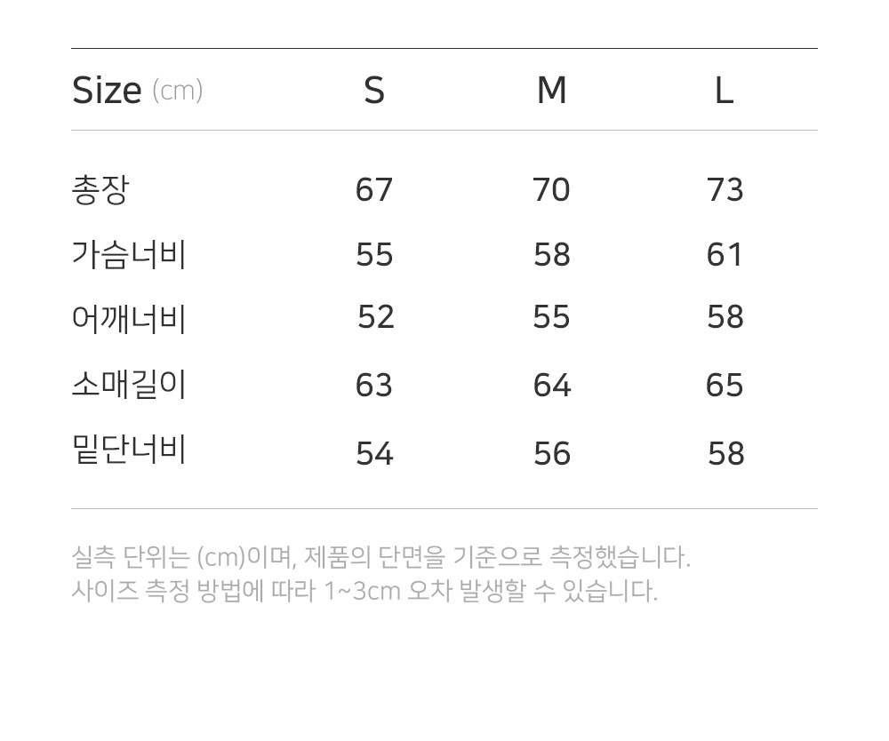 | 총장 | 가슴너비 | 어깨너비 | 소매길이 | 밑단너비 |