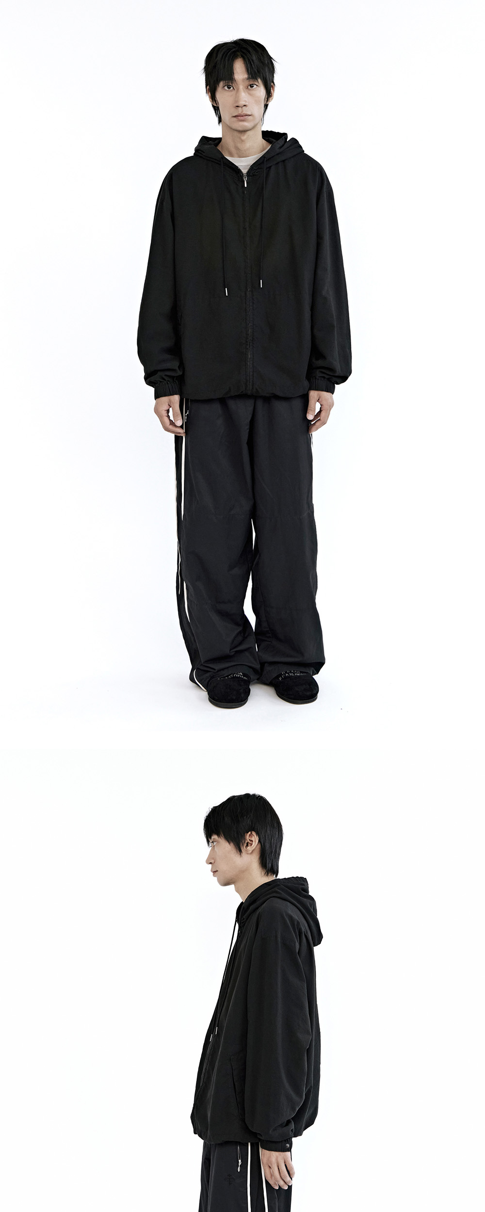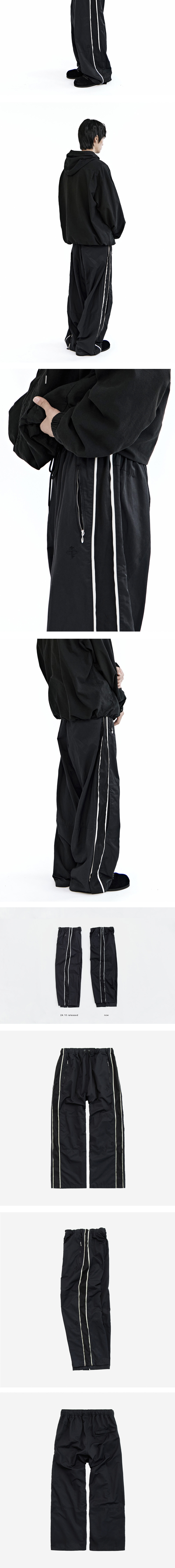 1011 nylon track pants - dark navy (snap ver.) - 23년도 기점으로 전개 중인 나일론 트랙 팬츠 - 90년대 풍의 웜업 팬츠 베이스 - 사틴 조직 나일론/코튼 소재의 바닥면 - 레트로한 뉘앙스의 별주 파이핑 사이드라인 - 폴리테루 로고 자수 및 협업 그래픽 자수 - 밑단 3개의 스냅 버튼 - 전면 2개의 지퍼 포켓 및 후면 1개의 지퍼 포켓 - 가먼트 워시에 의한 자연스러운 터치 및 색감 - 각 포켓과 무릎 아래는 메시를 대어 쾌적한 착용감 - 착용이 거듭되며 점점 부드러워지는 패브릭 사용 *모델: 170 중반 / 마른 체형, 3사이즈 착용 *직전 차수 대비, 금번 차수는 부드럽게 완성되어 드레이퍼리해졌으며 보다 어두운 톤으로 완성됐습니다. 본 제품은 직전 차수와 유사한 실측 및 착용감으로 제작되었습니다. 정확한 상세 사이즈의 경우, 실측표 확인 부탁드립니다.