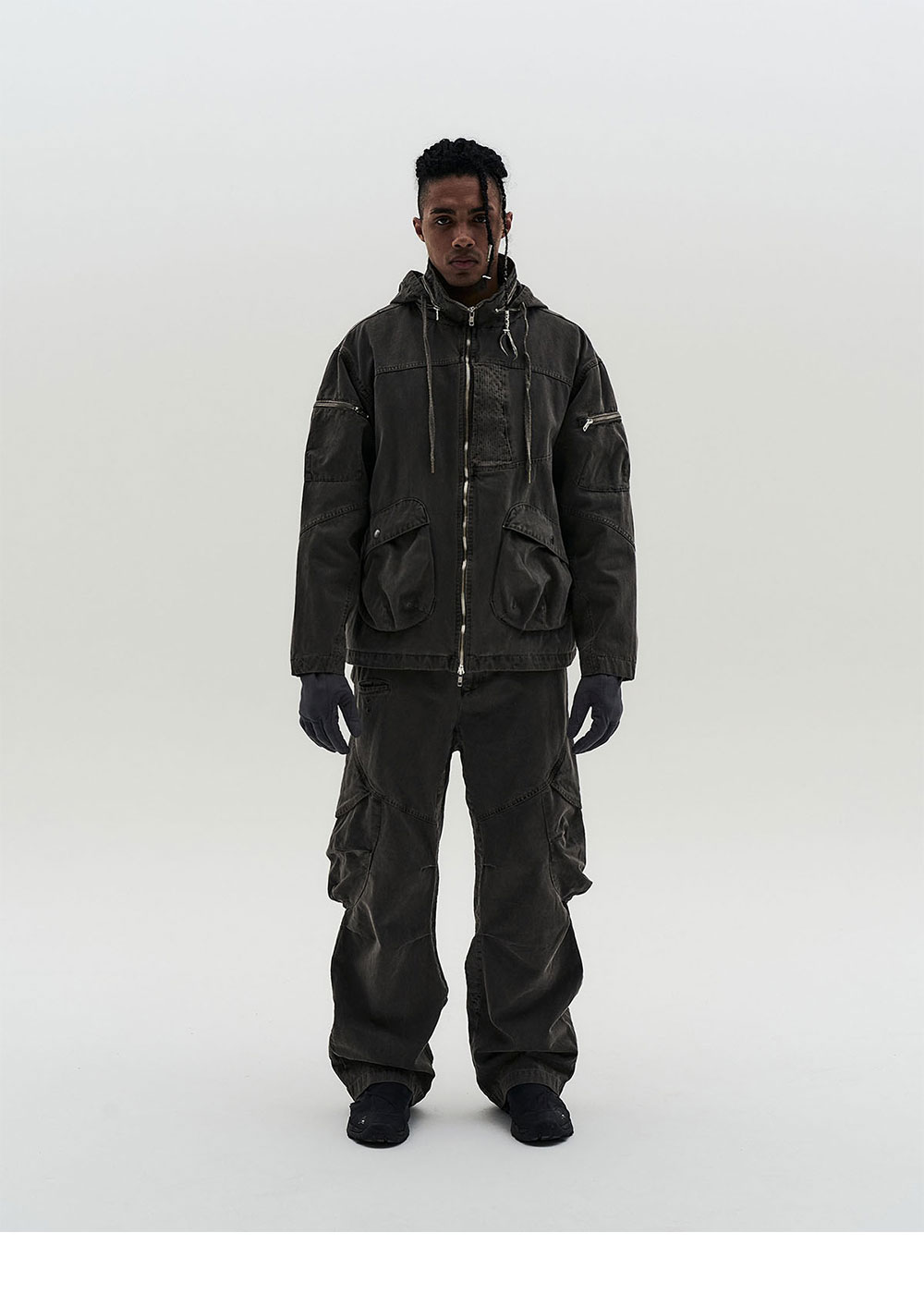 YKK 2WAY ZIPPER PIGMENT WASHING DYEING TECHNIQUE HIDDEN HOODIE FRONT CHEST HIDDEN POCKET FRONT 3D POCKET SLEEVE HEM SNAP ZIPPER POCKET ON INNER