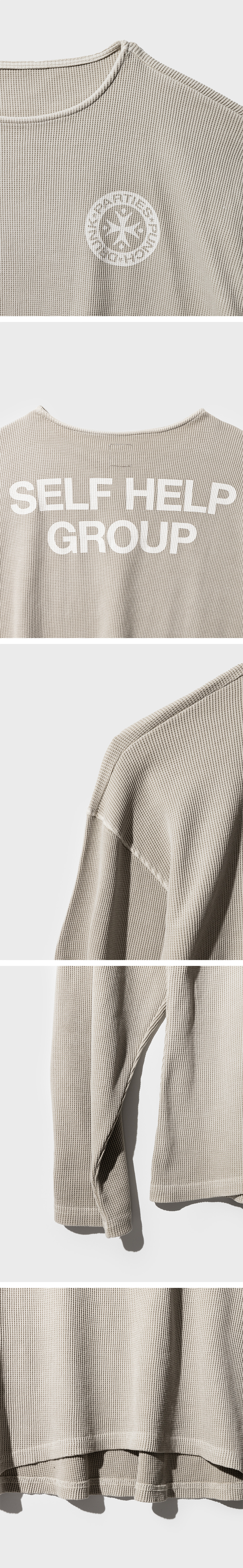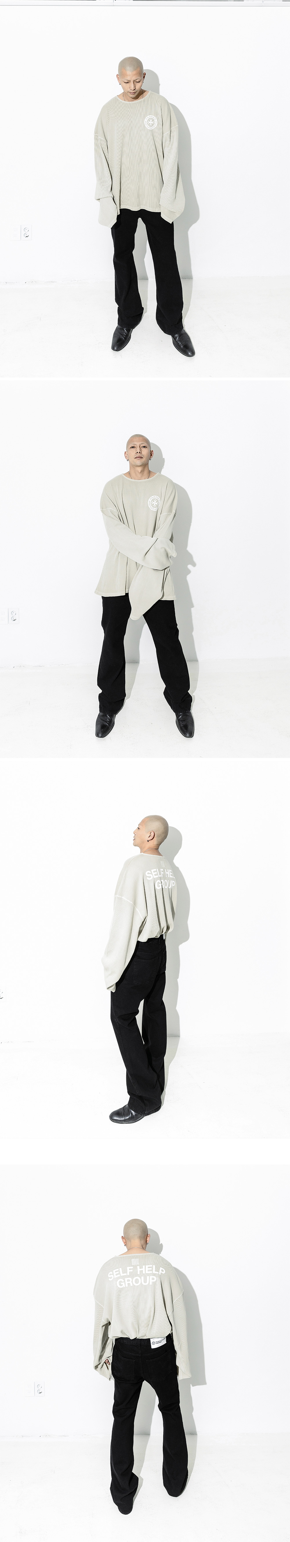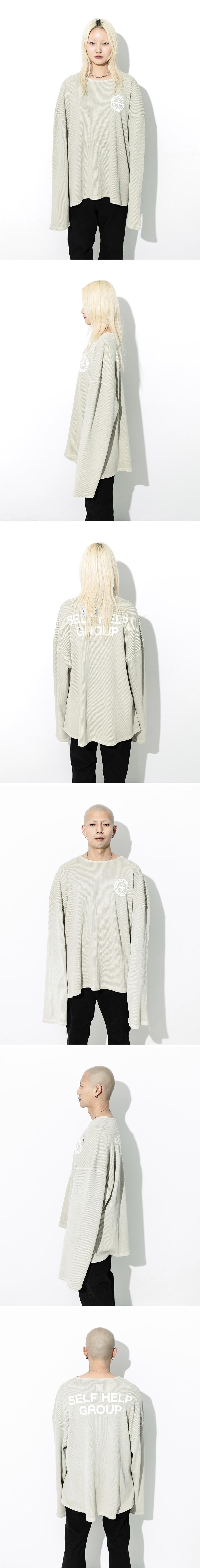 어깨선의 위치와 곡면으로 재단된 허리선, 각각 오목-볼록하게 설계되어 만들어 낸 앞 뒤 기장의 편차는 오버사이즈임에도 신체를 제대로 타고 흐르는 느낌을 만듭니다. 와이드한 넥라인은 립을 대지 않고 그대로 봉제하여 마감하며 암홀-소매의 팔 전체를 타고 테이퍼드하게 뻗어지는 패턴과 적절한 순간 Flare 하게 펼쳐지는 소매 끝자락의 조합이 극락입니다. 일반적인 날염이 아닌 Parties 특유의 실리콘 날염이 진행됩니다. 염색과정에서 프린트로의 이염이 보다 고급스럽게 연출되며, 탈락될 듯 말 듯 한 높은 표현력을 유지한 채로 아주 오랜기간을 견고하게 버텨주는 훌륭한 방식입니다. Sweatshirt의 대용으로도 충분한 위트있고 편한 제품으로, Knit 로서도 세련되게 실루엣을 표현할 수 있는 제품으로 사용자의 의도와 캐릭터에 맞게 해석되길 바라는 마음으로 만들었습니다. 거기에 ‘SELF HELP GROUP’ 정체성입니다, 가볍게 실어보냅니다.