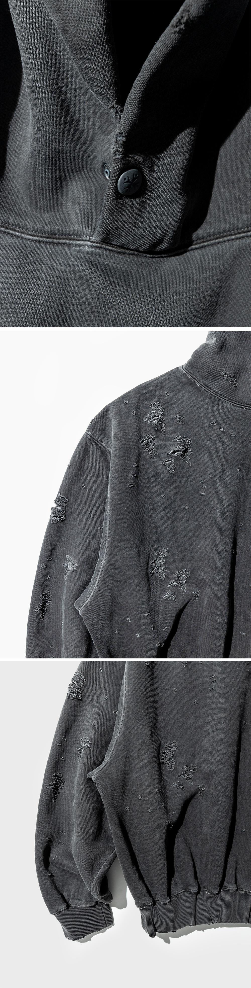 100% Cotton, Oversized Silhouette Garment Dyed, 4 Time Sillicone Print 100% 면, 오버사이징 실루엣 가먼트 다이, 4회 실리콘 날염 - 'Gyeolsoc' 심볼의 본질을 노골적으로 형상화하는 작업을 거쳤고 안정된 상징 위로 발화하는 모습을 그리고 싶었습니다. 엄연히 '훼손' 된 제품이니, 내부 작업물 정도로 봐주시면 좋겠습니다. 만들어진 완제품에 두 번의 정밀한 데미지 공정을 거친 후, 새로운 그래픽을 레이어링 날염합니다. 기존의 Garment Dyed Hoodie와 컬러 및 패턴상의 차이는 전혀 없습니다. 염색 공정의 특성 상, 이염의 가능성이 높습니다. 반드시 최초 착용 전 ‘단독세탁’ 부탁드리며 제품을 충분히 즐기기 위해 적극적인 세탁을 권장합니다.