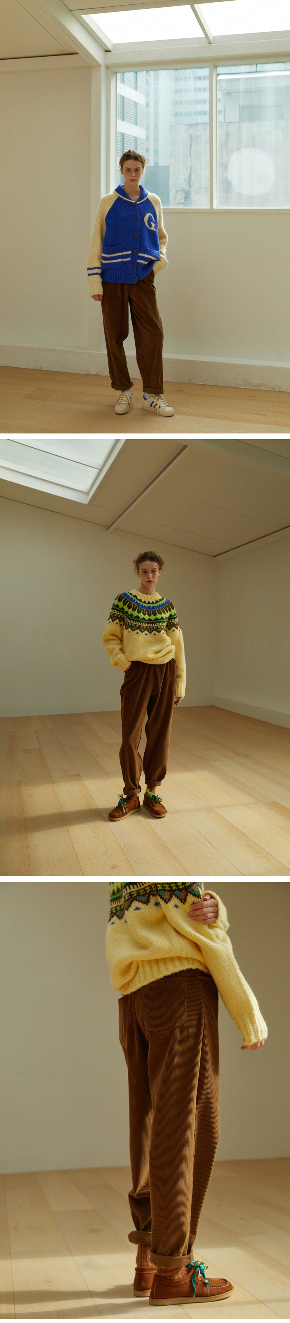 *예약배송 안내 [1/25 예약배송] 보온성이 높은 코듀로이원단으로 제작한 팬츠뒷면에만 밴딩처리해, 상의를 넣어 입을 수 있도록 제작허리선의 다트, 엉덩이품을 넉넉히 해 편안한 실루엣밑단 롤업연출로 다양한 스타일링이 가능한 제품자연의 원료로 제작된 시그니처향과 함께 배송됩니다.