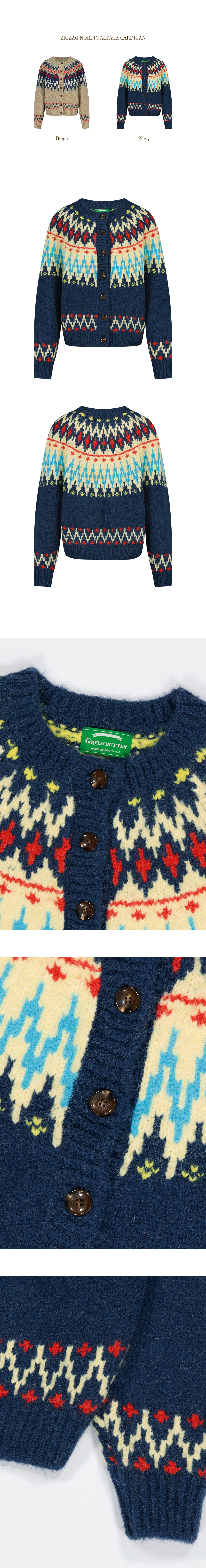 그린버터 우먼 지그재그 노르딕 알파카 가디건 네이비