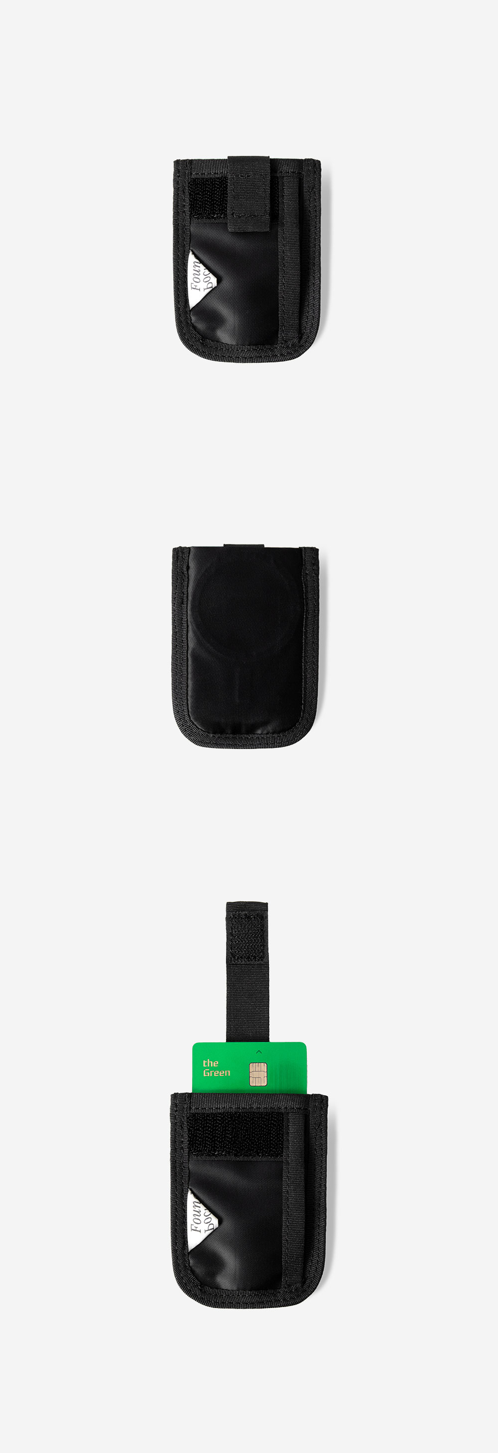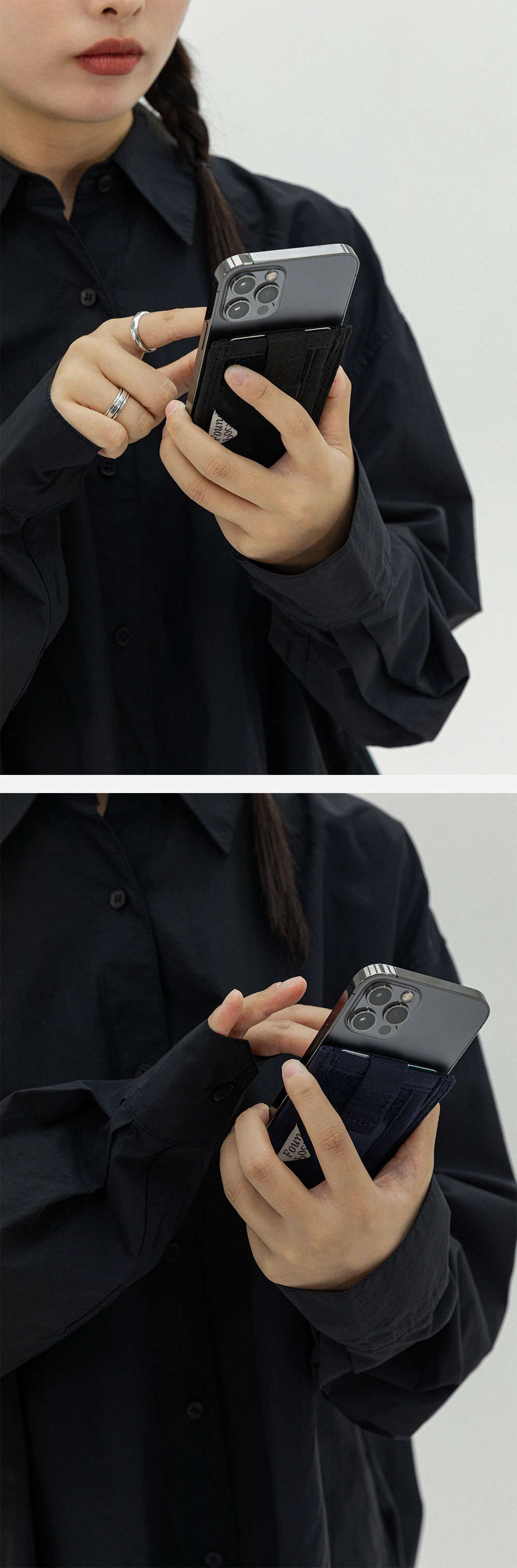 PRODUCT: ACC COLOR: BLACK SIZE: W:7.3cm L:9.8cm OUTSHELL: NYLON 100% LINING: NYLON 100% PRICE: 38,000 KRW - 맥세이프 자석을 이용한 카드 케이스 - 벨크로를 이용한 끈으로 빠르고 편한 카드 이용 및 이탈 방지 - 자성으로 인한 카드 손상 방지 장치 내장 - 교통 카드 태그 가능 - 서브 포켓을 이용한 비상금 등의 보관 용이 - 카드 케이스 사이즈에 적합한 기종은 아래와 같습니다. iPhone 12 이후 기종부터 iPhone 15, 15 plus, 15 pro, 15 pro max iPhone mini 기종에는 카드케이스의 사이즈가 조금 더 큽니다. 이 점 구매에 참고 부탁드립니다.