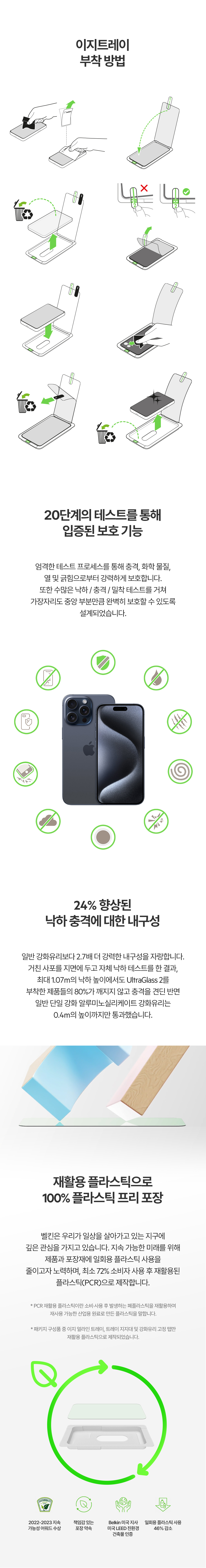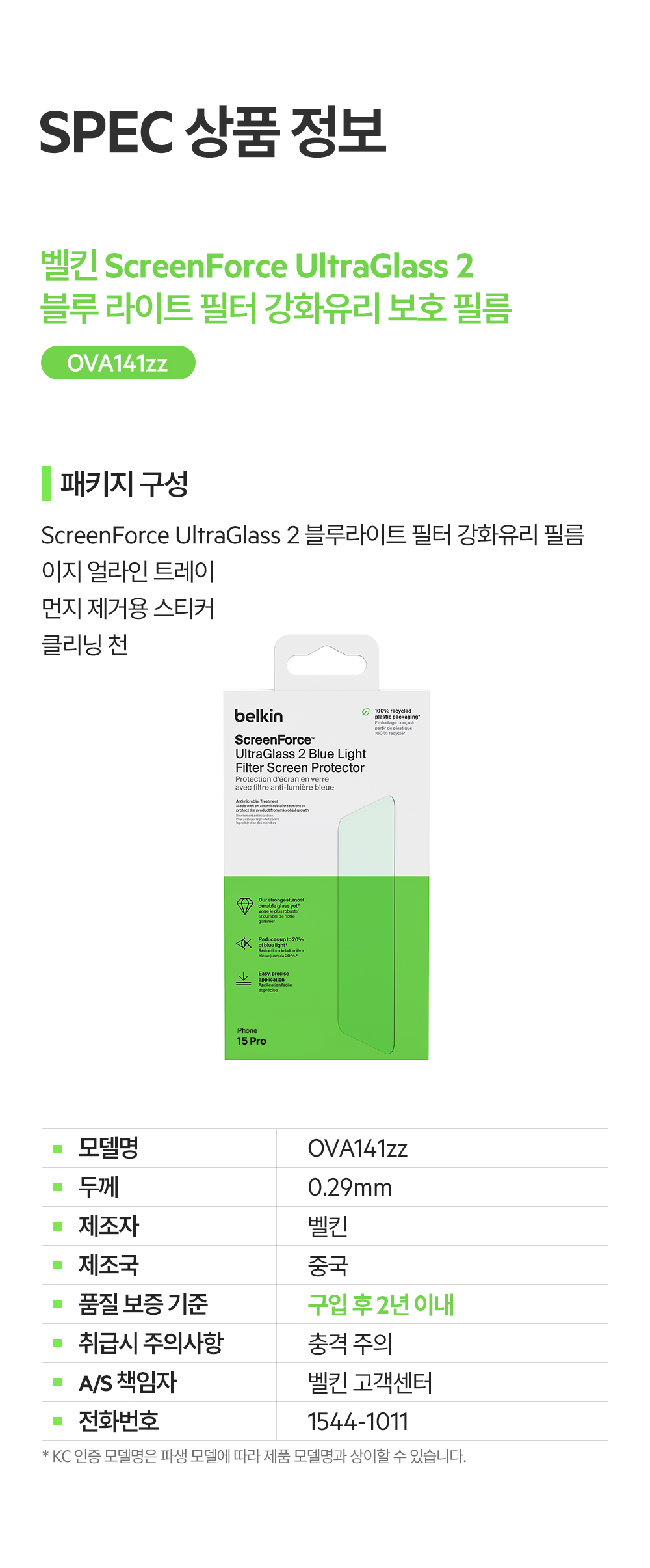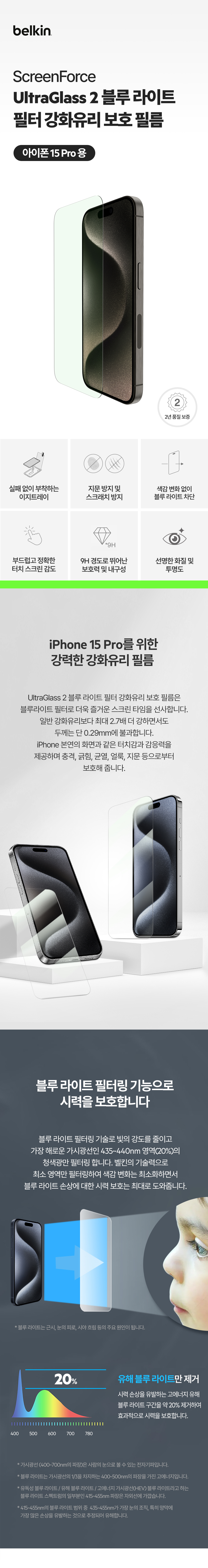 벨킨 아이폰15프로 블루라이트 차단 강화유리필름 OVA141zz