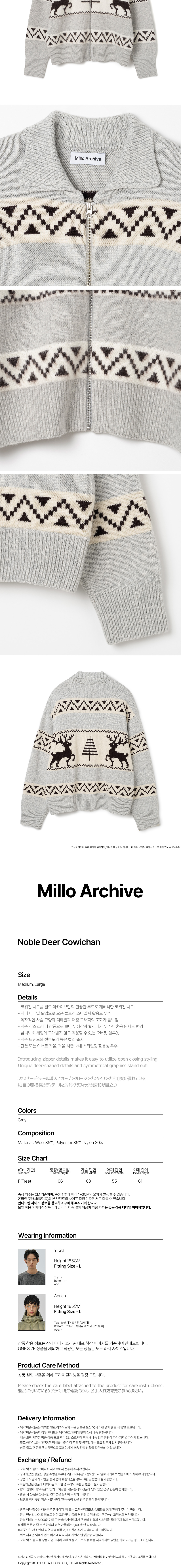 - 코위찬 니트를 밀로만의 깔끔한 무드로 재해석한 니트 - 지퍼 디테일 도입으로 스타일링 활용도가 높음 - 독자적인 사슴 모양의 디테일과 대칭 조화가 돋보이는 코위찬 - 남녀노소 체형에 구애받지 않고 착용할 수 있도록 수차례 핏 연구를 진행 함 - ONE SIZE지만 남녀모두 깔끔하고 자연스러운 실루엣으로 착용 가능 - 코위찬 문양과 이상적인 조화를 이루는 컬러를 기획, 연구하여 출시 - YKK사의 지퍼를 사용하여 내구성이 좋으며 다양한 코디 연출 가능