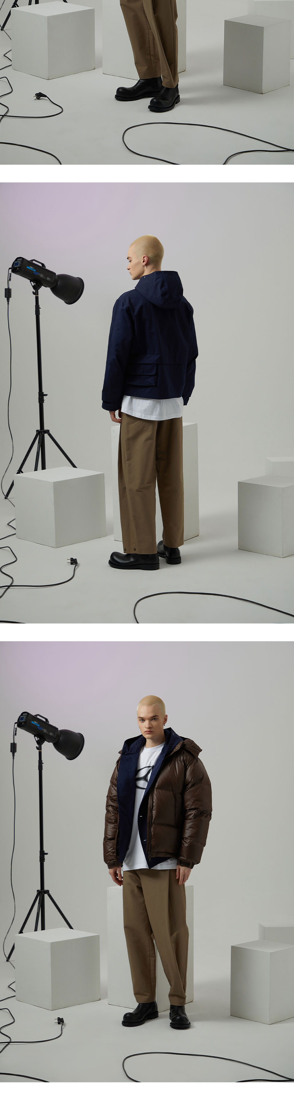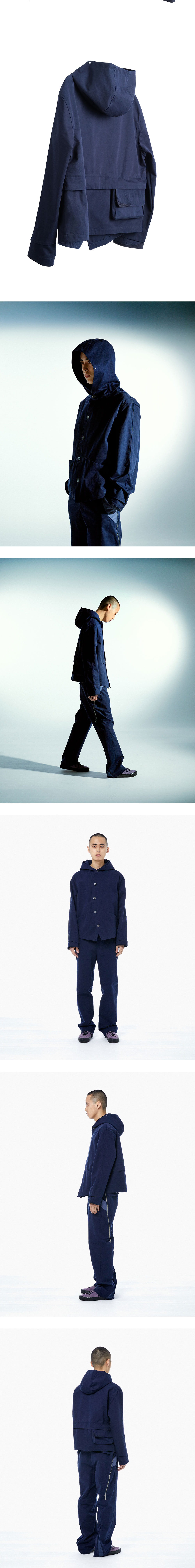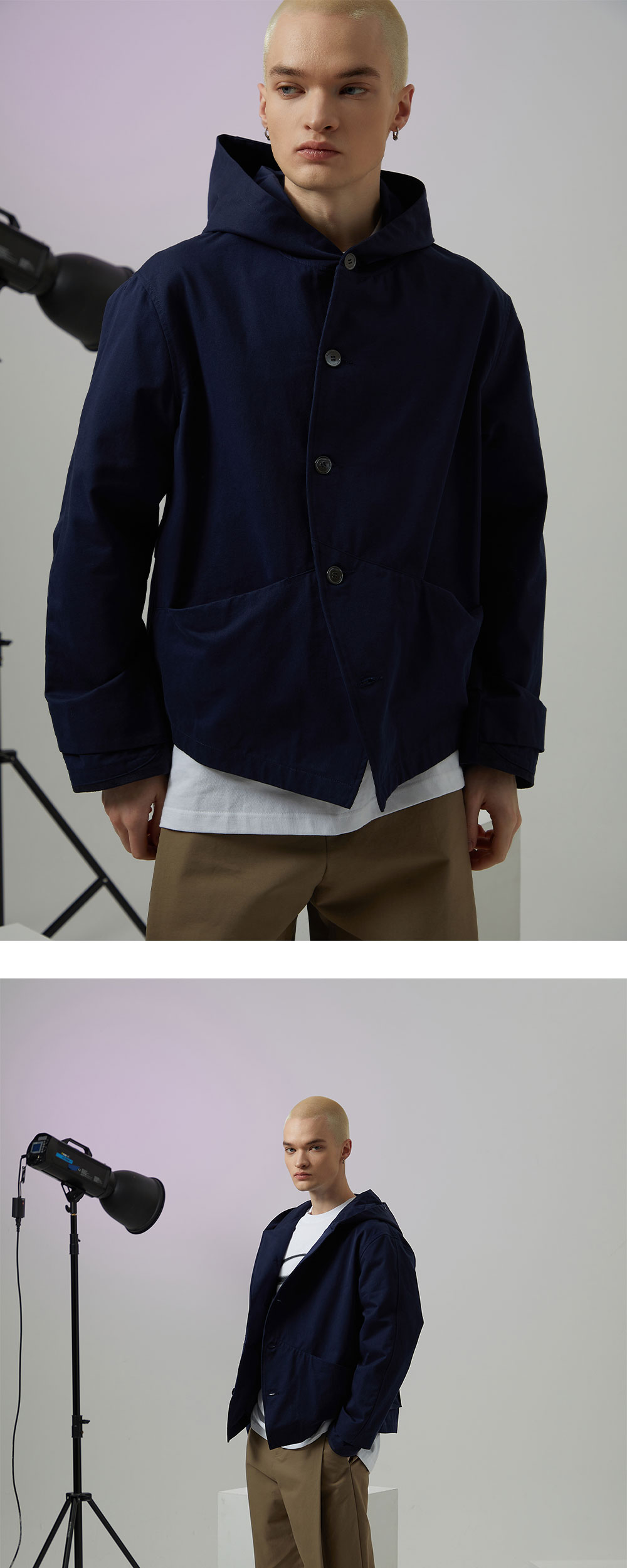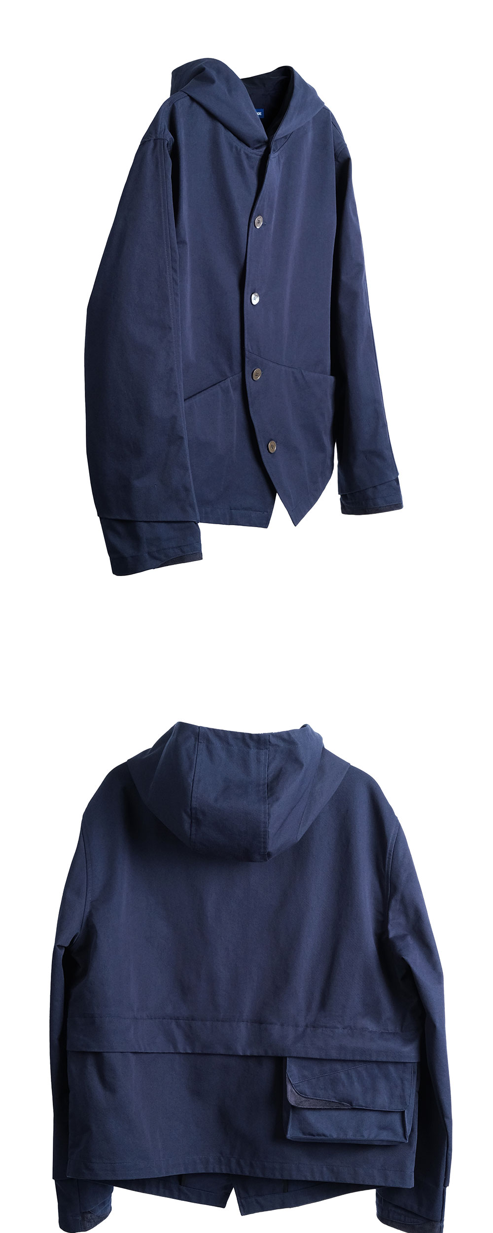 curved front line two seam pockets detachable pocket at back mother of pearl buttons star embroidery at hoodie main fabric : 38% cotton 62% nylon sub fabric : 100% polyester made in korea size(front length/back length/shoulders/chest/sleeve) 46 : 68cm/62cm/50cm/60cm/62.5cm 48 : 69.5cm/63cm/51.5cm/62.5cm/63cm the model is 181cm tall and is wearing a size 48