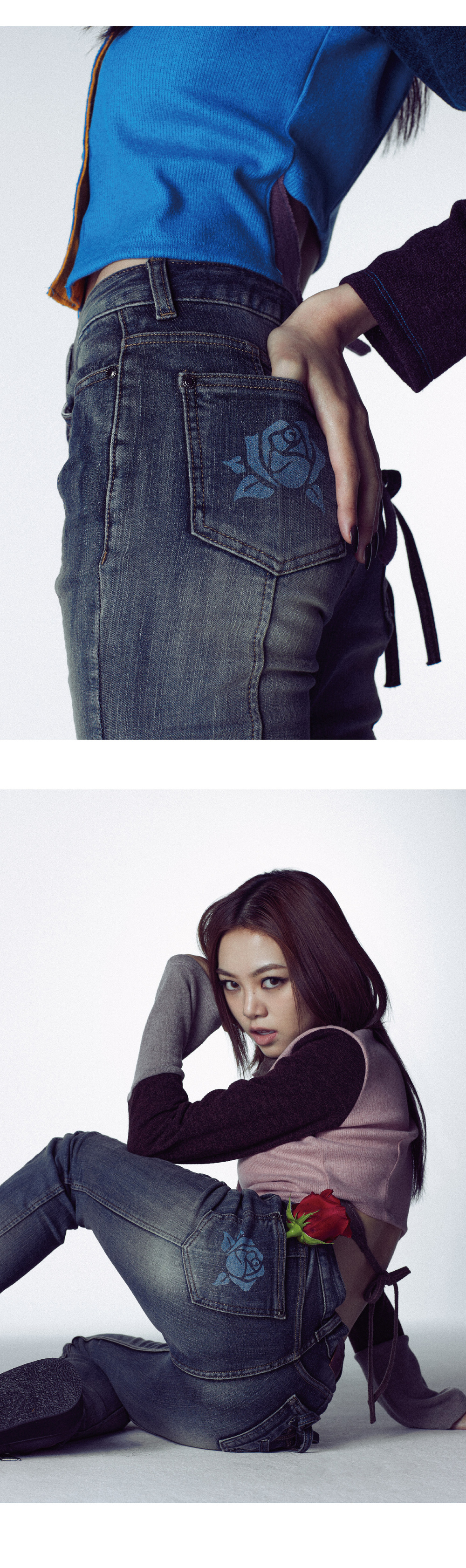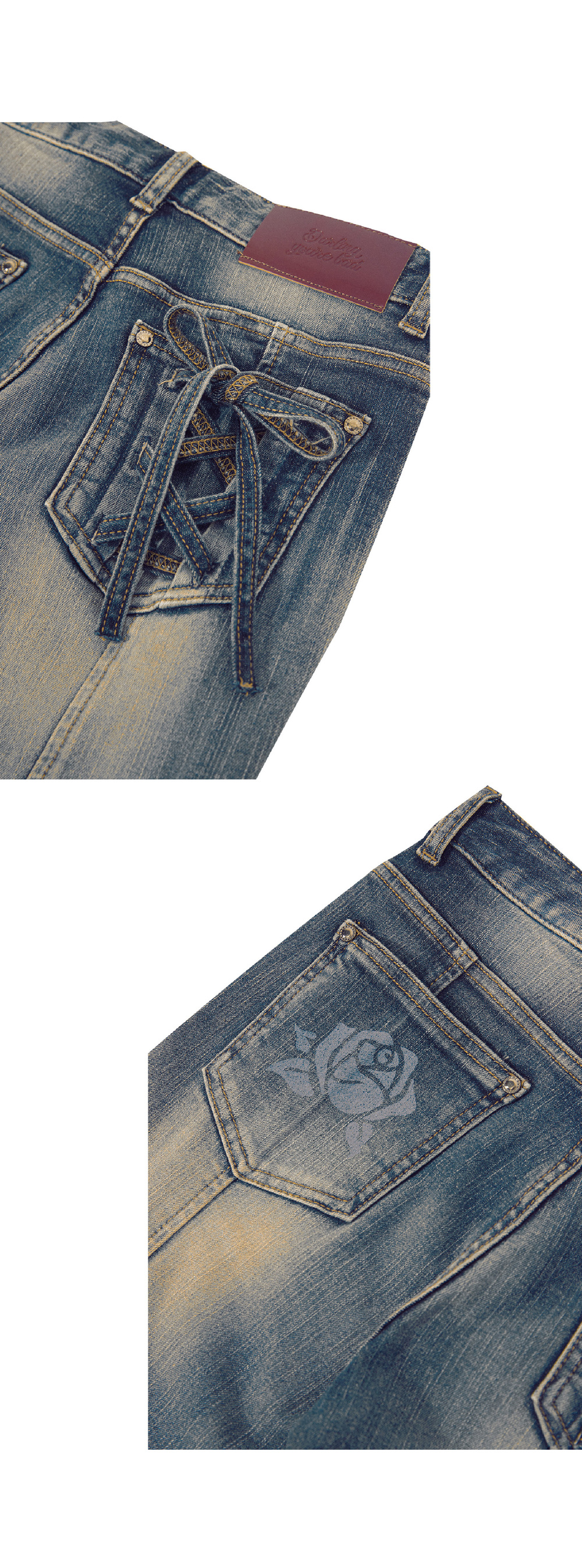 [PRODUCT DETAILS] - 슬림핏 부츠컷 데님 - 시그니처 로즈 심볼 프린팅 포켓 - 코르셋 디테일 포켓 - 달링유어배드 로고 각인 흑니켈 켄톤 - 흑니켈 리벳 *뒷포켓의 코르셋 끈은 자유롭게 잘라 길이 조절이 가능합니다.