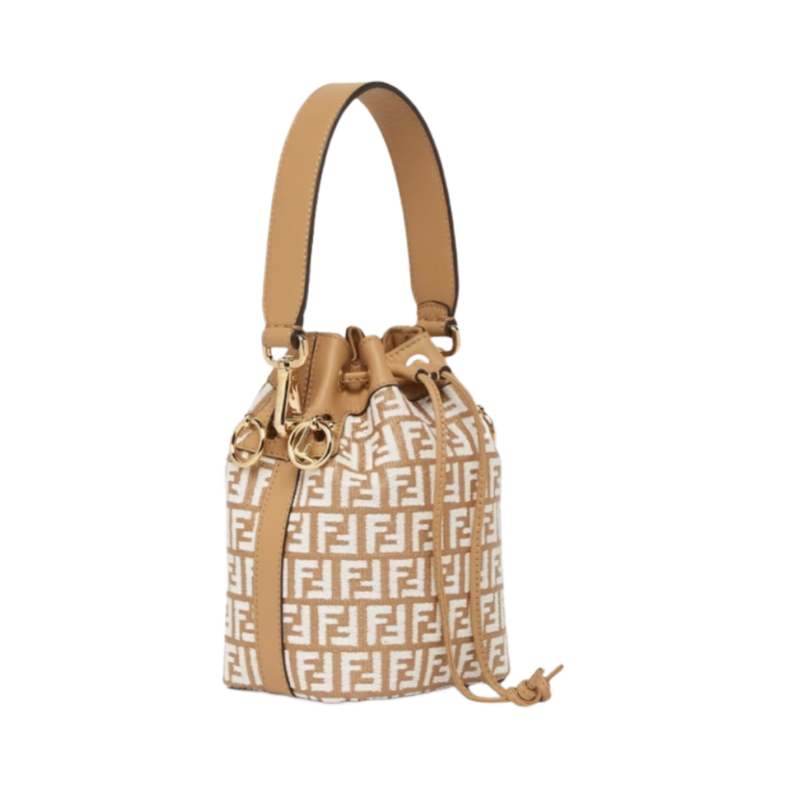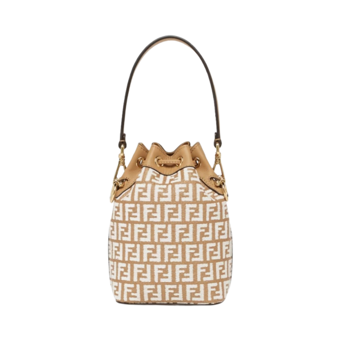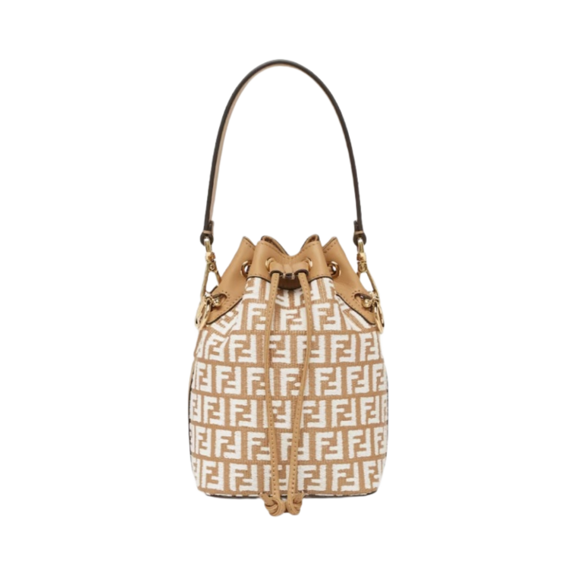 Fendi Mon Treso Tapestry Fabric FF Motif Raffia Mini Bag White