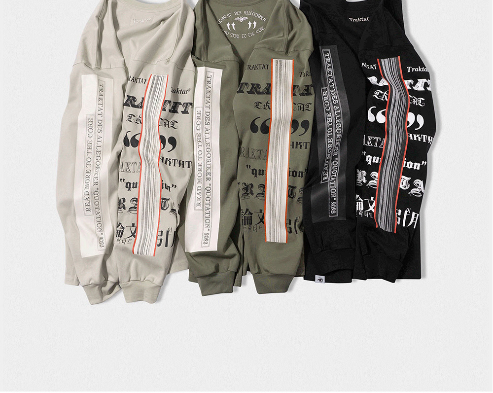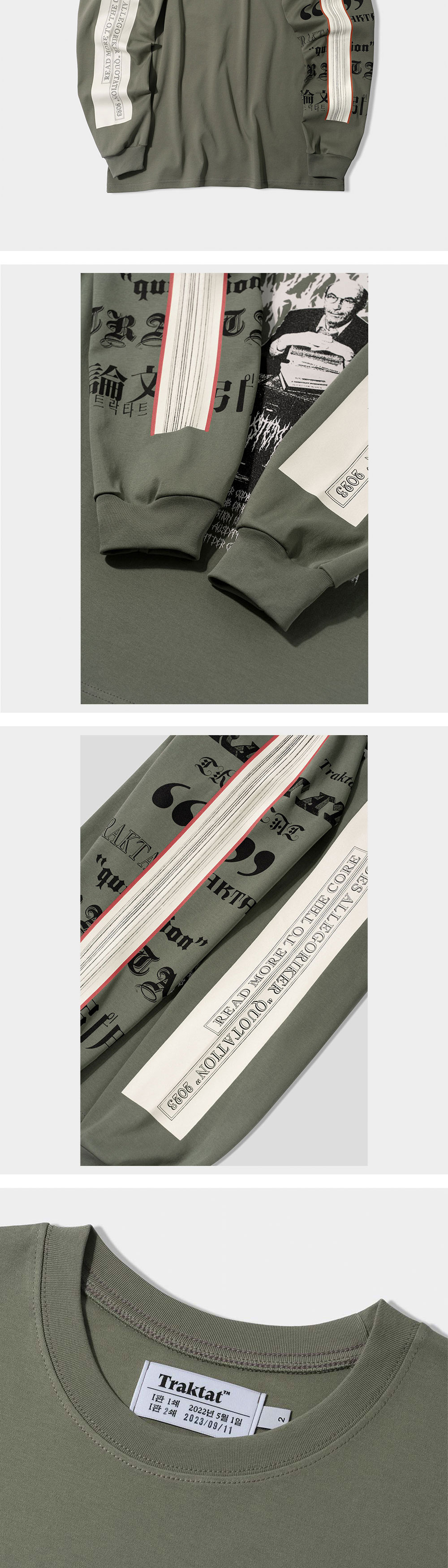 - 20수 2합(10수) 면 100% - 실켓 & 바이오 효소 가공 - 책등과 책배 부분을 표현한 슬리브 프린팅 - 뒷판 상단 로고 자수 디테일 - 아웃사이드 바인딩(Outside binding) : 트락타트만의 특징적인 봉제 방식으로 어깨 라인을 체인스티치로 마감하였습니다. - 루즈 핏/드롭 숄더 - 1판 1쇄 메인 라벨 - Ex-Libris 케어라벨
