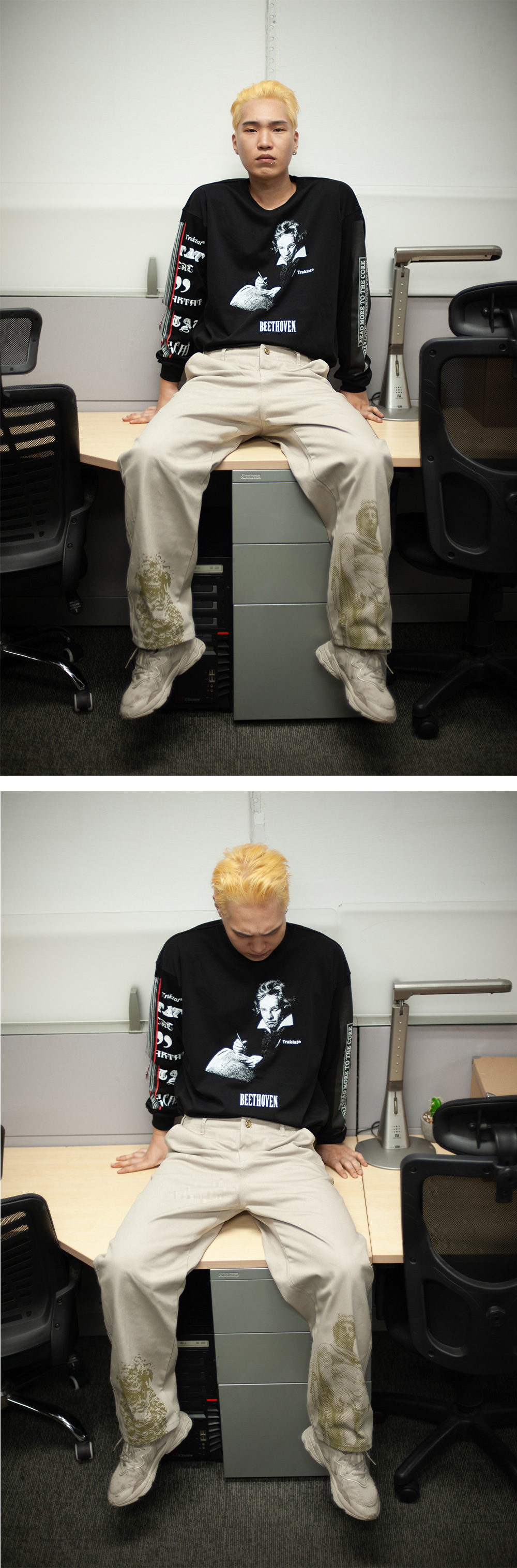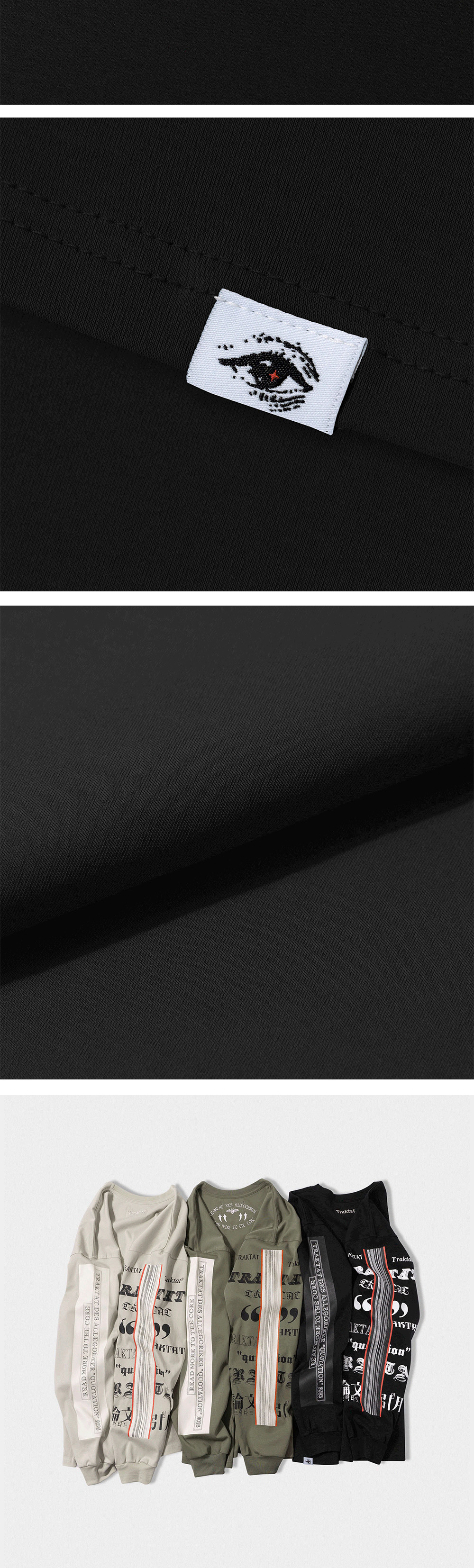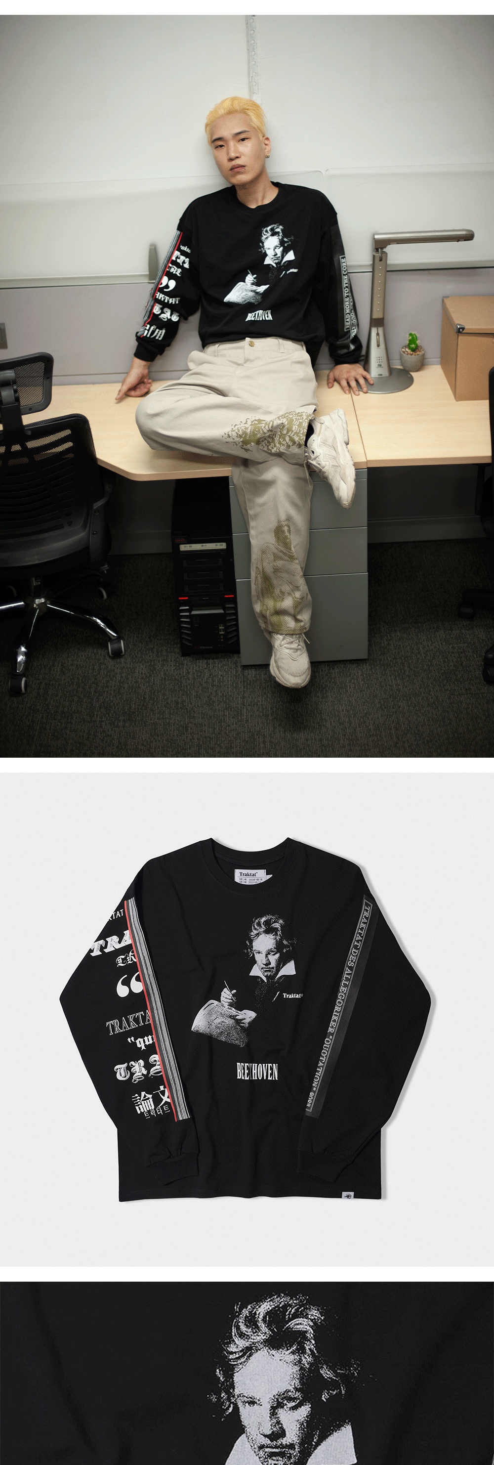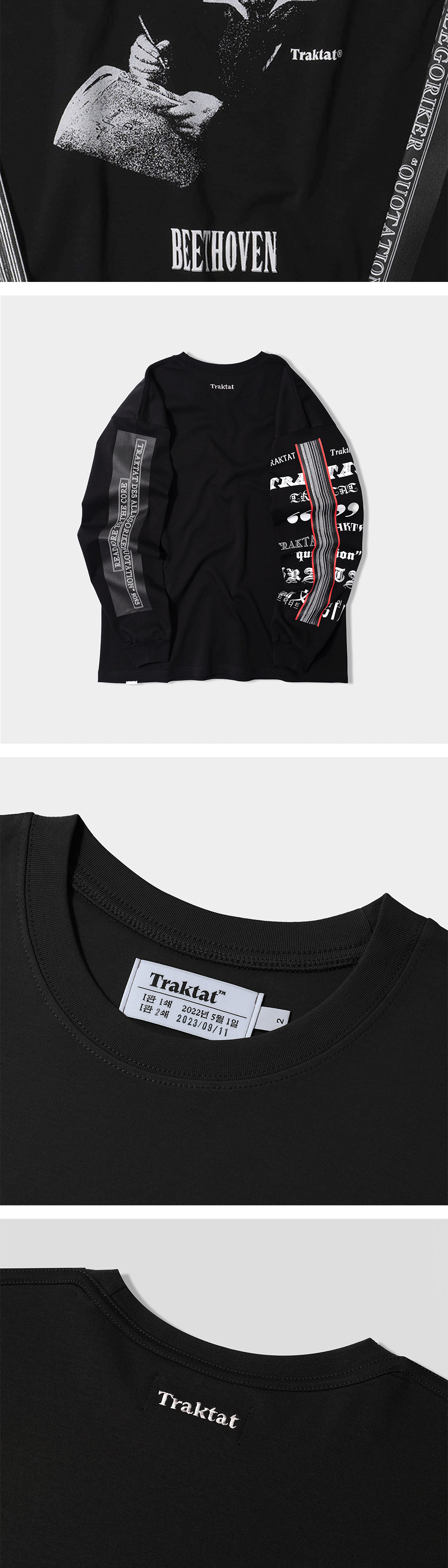 “음악은 어떠한 지혜, 어떠한 철학보다도 높은 계시다. 나의 음악의 의미를 파악하는 사람은 다른 사람들이 빠져 있는 모든 비참에서 벗어날 수 있다.” - Ludwig van Beethoven - 20수 2합(10수) 면 100% - 실켓 & 바이오 효소 가공 - 책등과 책배 부분을 표현한 슬리브 프린팅 - 뒷판 상단 로고 자수 디테일 - 아웃사이드 바인딩(Outside binding) : 트락타트만의 특징적인 봉제 방식으로 어깨 라인을 체인스티치로 마감하였습니다. - 루즈 핏/드롭 숄더 - 1판 1쇄 메인 라벨 - Ex-Libris 케어라벨