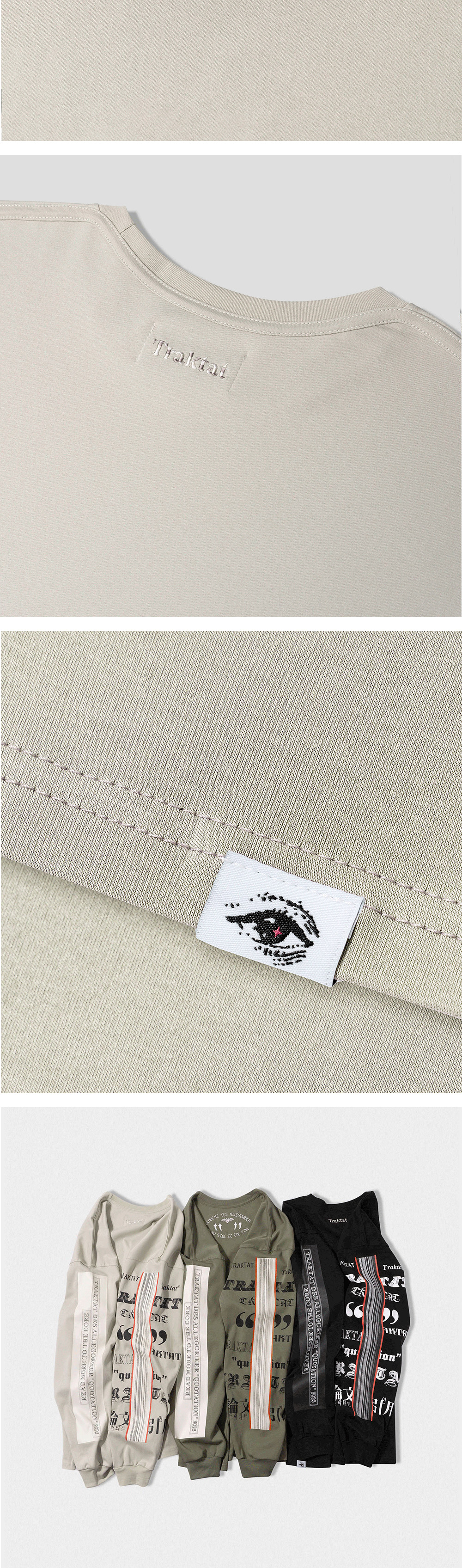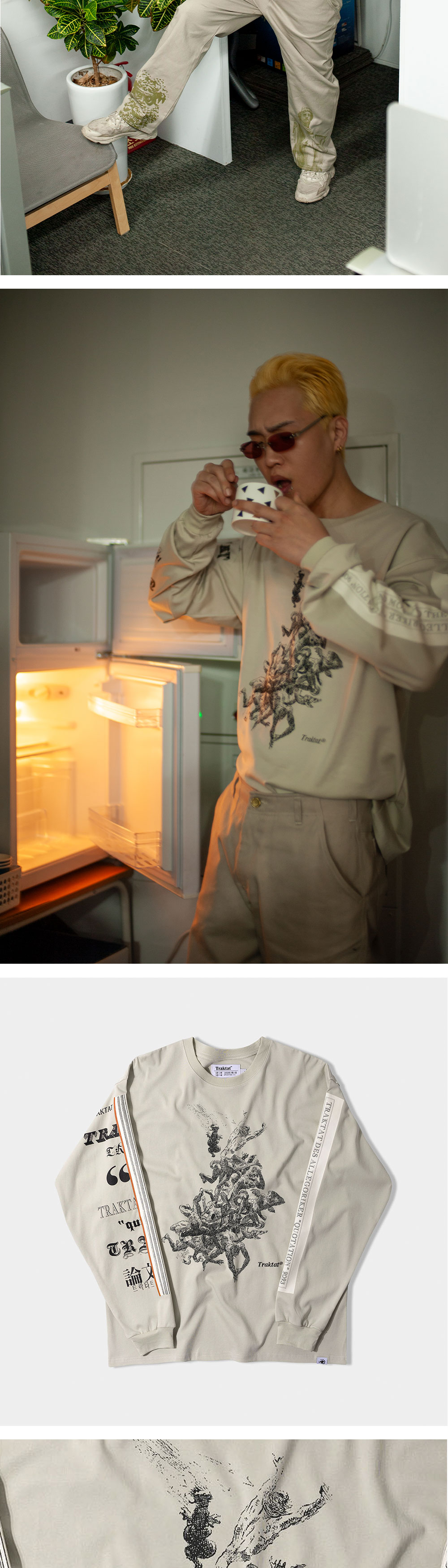 - 20수 2합(10수) 면 100% - 실켓 & 바이오 효소 가공 - 책등과 책배 부분을 표현한 슬리브 프린팅 - 뒷판 상단 로고 자수 디테일 - 아웃사이드 바인딩(Outside binding) : 트락타트만의 특징적인 봉제 방식으로 어깨 라인을 체인스티치로 마감하였습니다. - 루즈 핏/드롭 숄더 - 1판 1쇄 메인 라벨 - Ex-Libris 케어라벨