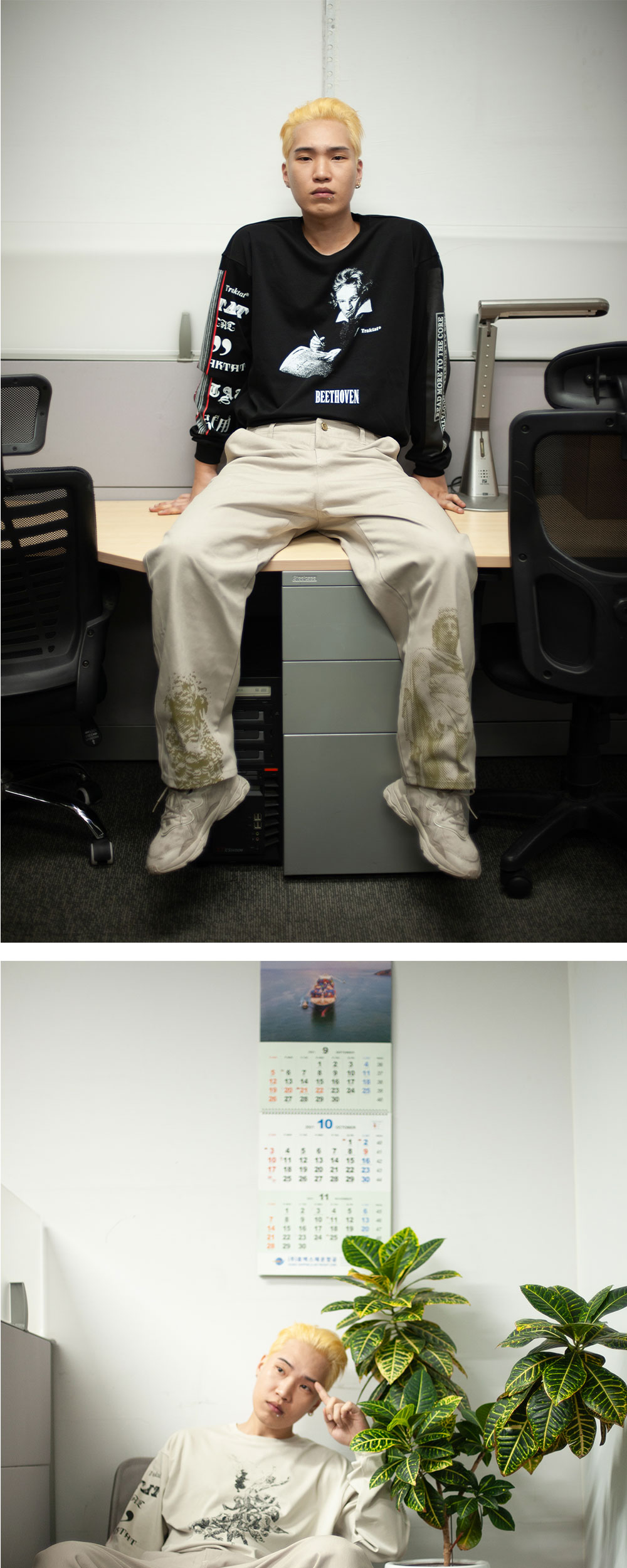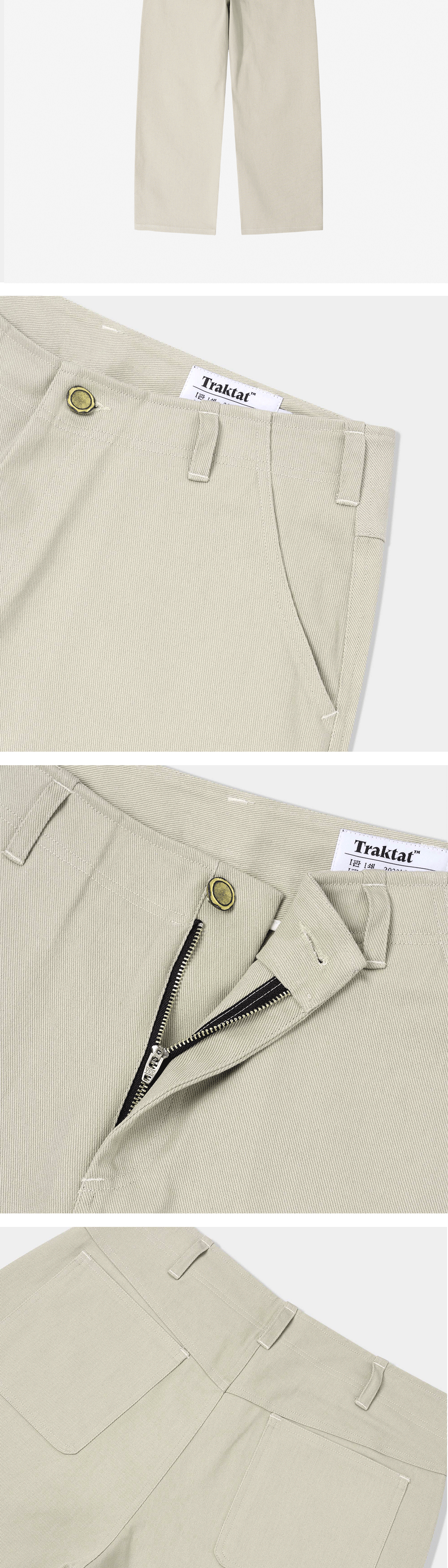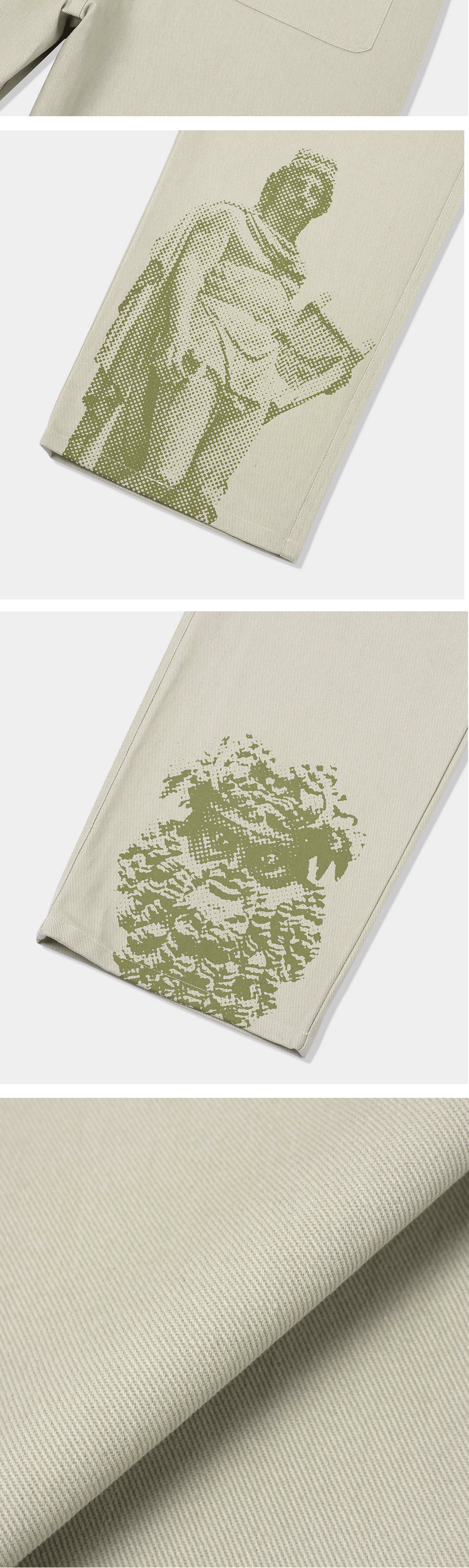 양질의 면 100% 7수 고밀도 트윌 원단을 사용해 어떤 상황에서도 쉽게 해지지 않도록 튼튼하게 제작했습니다. 더불어 두 번의 샘플 과정을 거쳐 바지 기장을 세밀히 조정했기에 앉았을 때도 하단 나염이 선명하게 보입니다. 앉을 때 이물감이 느껴질 수 있는 리벳 대신 여러 개의 바텍으로 마감하여 편안한 착용감을 선사합니다. 바지 안쪽 허릿단에는 일반적인 TCG 원단 대신 부드러운 면 100% 원단으로 감싸 착용감을 개선했습니다. 고뇌하며 길을 걸을 때, 그리고 책상에 앉을 때마다 디오니소스와 아폴론의 가호가 함께하길 바랍니다. - 바지 하단 디오니소스와 아폴론(D&A) 나염 - 스트레이트 루즈 핏 - YKK 지퍼 플라이 방식 - 니켈 소재의 비정형 탑 버튼 채택 - 1판 1쇄 메인 라벨 - Ex-Libris 케어라벨