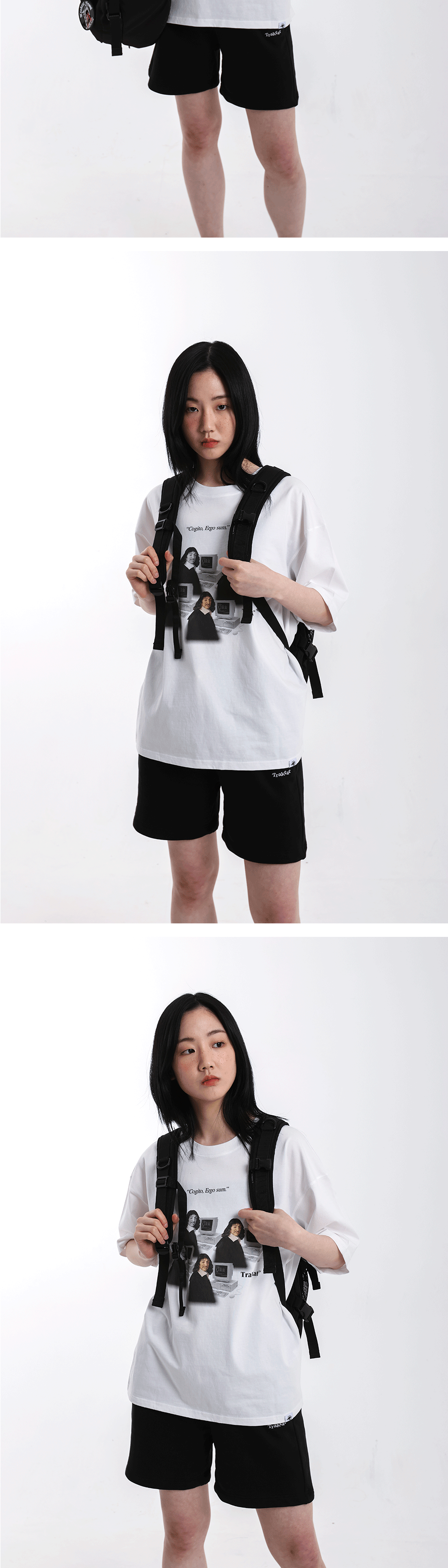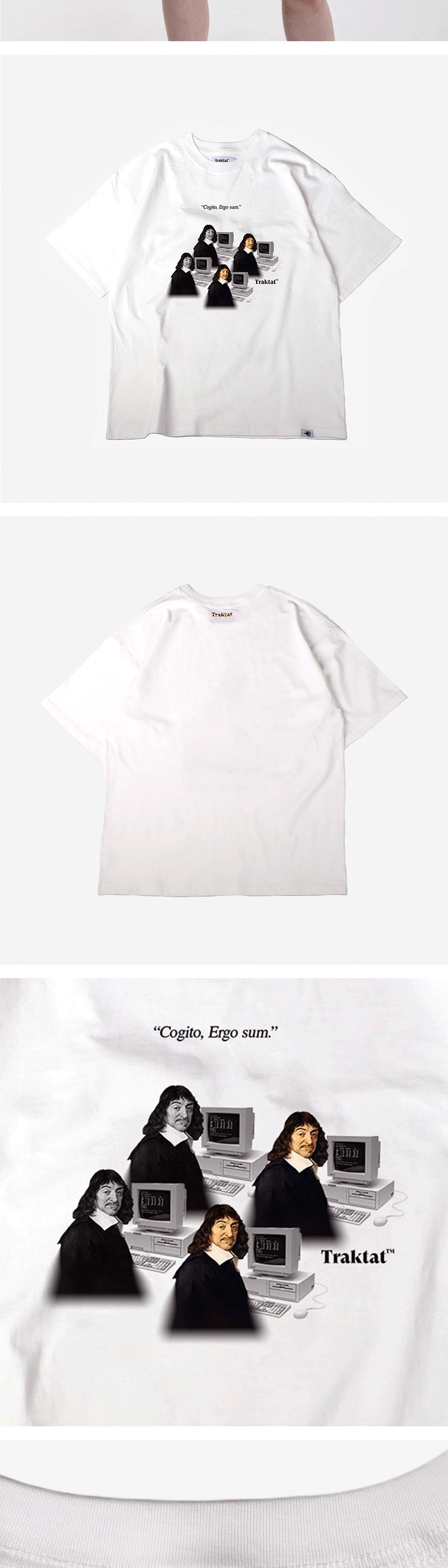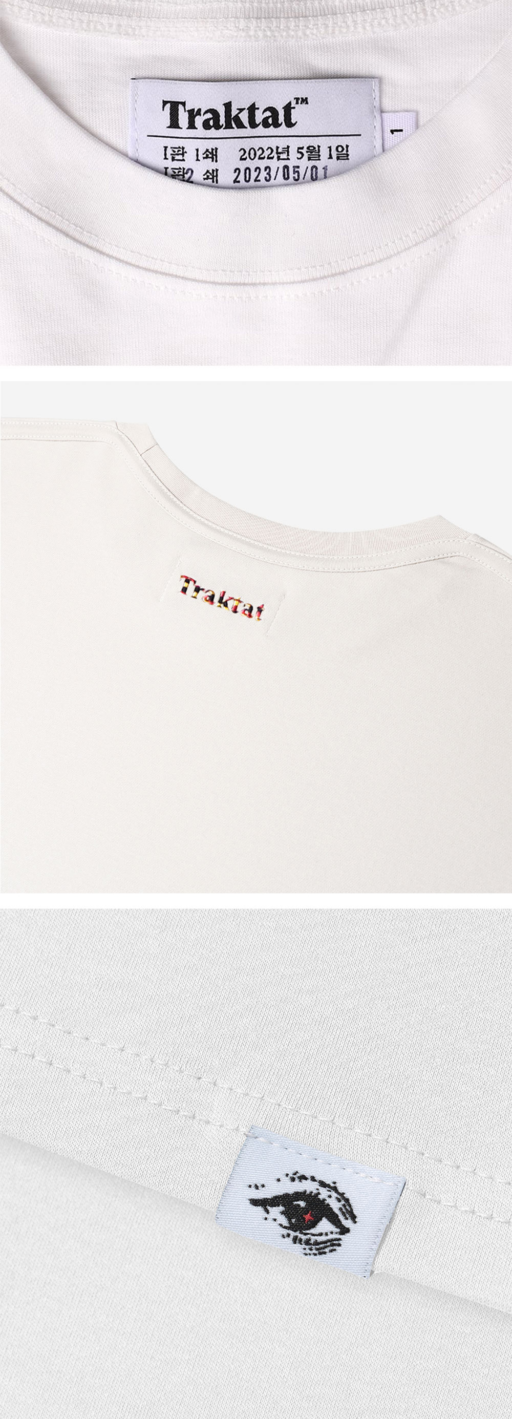 [4th Restock] Detail - 16수 면 100% - 실켓 & 바이오 효소 가공 - 뒷판 상단 자수 디테일 : 특수 실을 사용해 개체마다 색 배합이 조금씩 다릅니다. - 아웃사이드 바인딩(Outside binding) : 트락타트만의 특징적인 봉제 방식으로 어깨 라인을 체인스티치로 마감하였습니다. - 루즈 핏/드롭 숄더 - 1판 1쇄 메인 라벨 - Ex-Libris 케어라벨