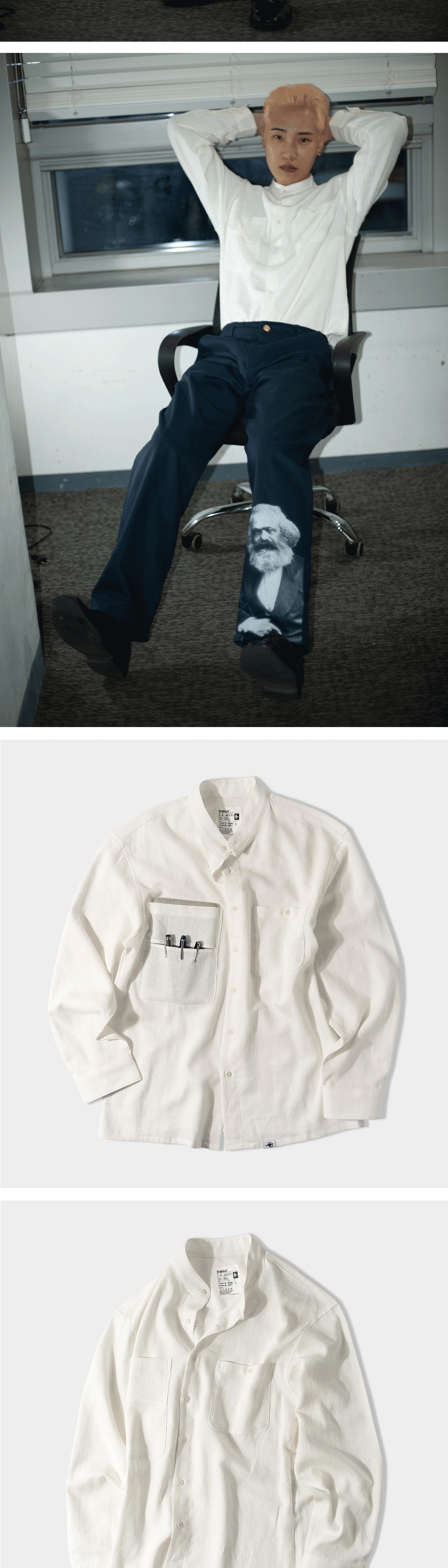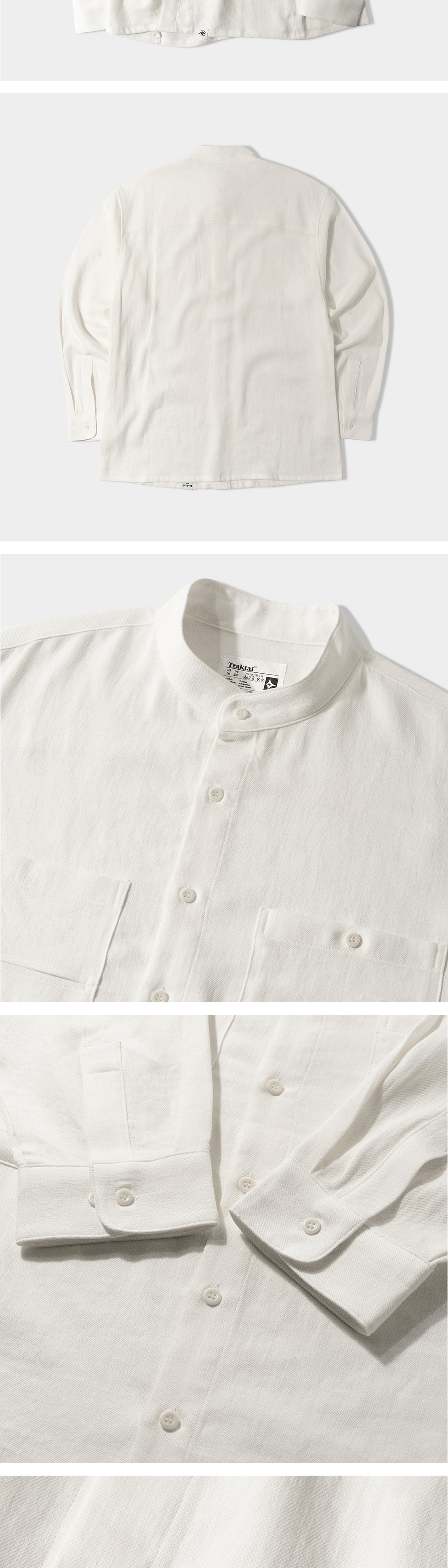 도서관에 앉아 책을 읽고 글을 쓰는 당신을 떠올리며 만들었습니다. 단상으로부터 시작해 한 편의 완성된 논문까지 도달하는 과정은 언제나 평탄하지 않습니다. 글을 완결시키기 위해서는 수많은 준비 단계가 필요합니다. 쿵푸 셔츠는 편안하고 따뜻한 도구로서 그 치열한 과정에 함께 할 것입니다. 책을 읽기 전 마시는 따뜻한 커피와, 글을 쓰기 전 펜촉에 묻히는 잉크처럼요. - 린넨 55%, 면 45% - 바이오 효소 가공 - 세미 루즈 핏 - 2-Way 스탠드 칼라 - 1판 1쇄 메인 라벨 : 원단 조성과 사이즈 등을 직접 작성하여 개체마다 조금씩 다릅니다. - 키클롭스 포켓 : 키클롭스의 눈을 닮은 절개 포켓으로 다양한 활용이 가능합니다. - 넥라인 이중덧댐처리 - 각인된 너트 단추 사용